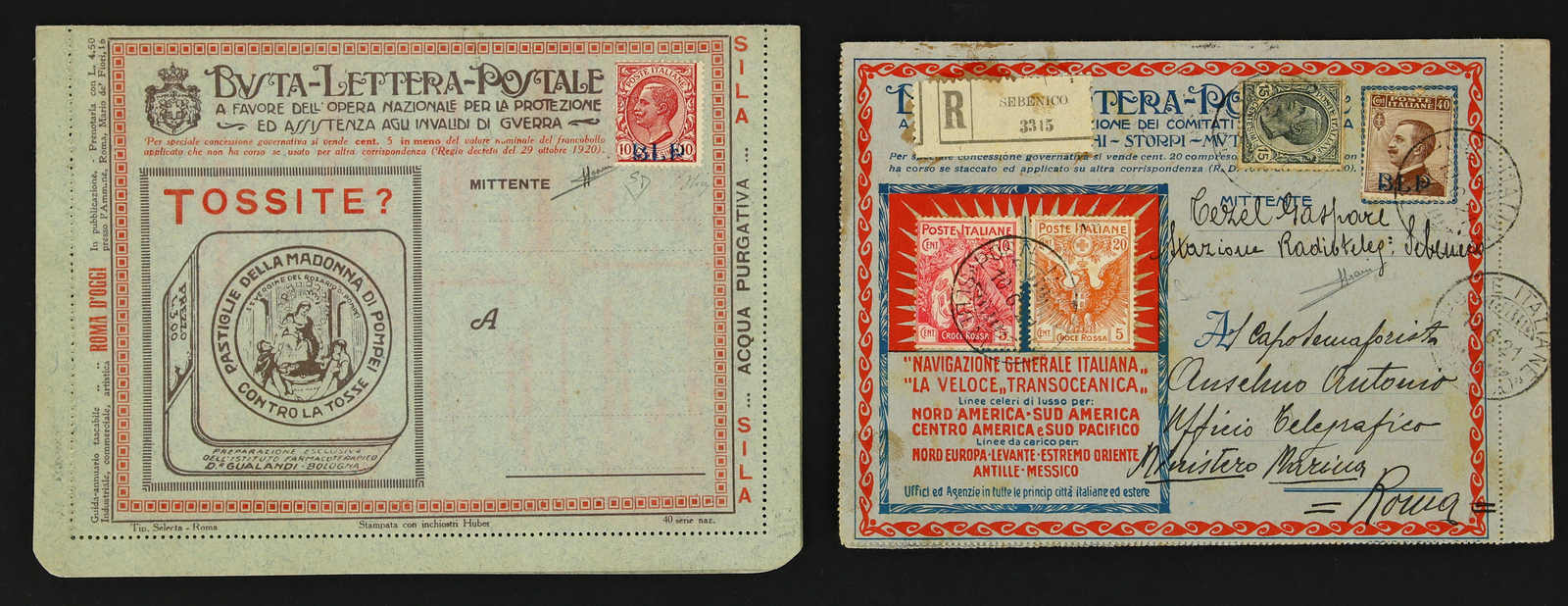 1921, special card letters with advertisement "Franca lettera", one of them used from Sebenico to Roma and the other unused bearing B.L.P. overprinted stamp, Sassone 1 and 4 (Image) (imagea)