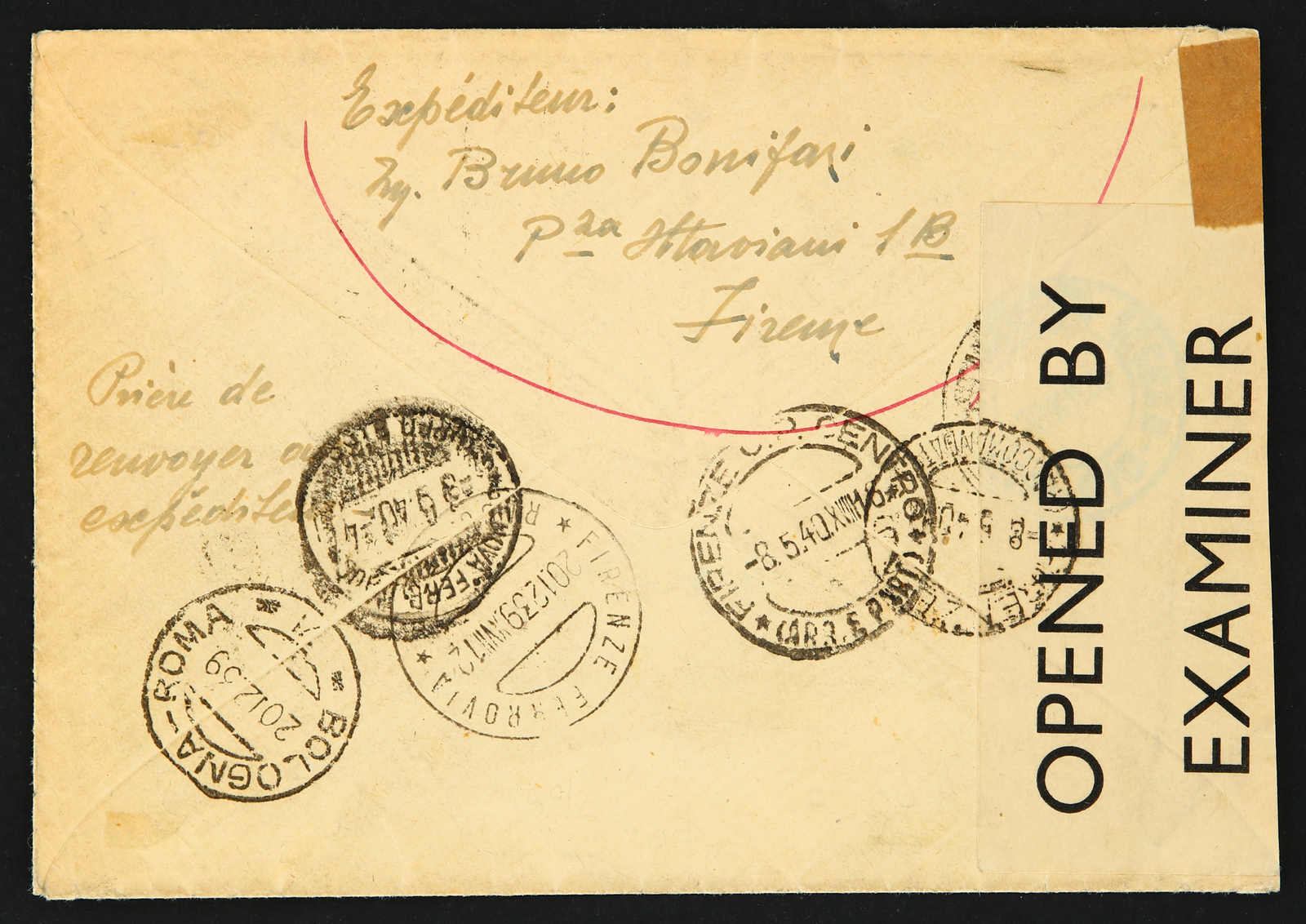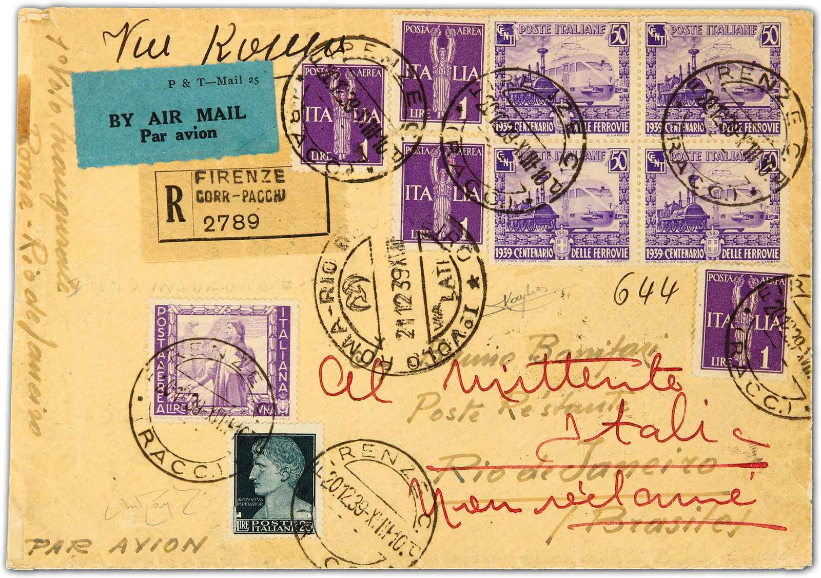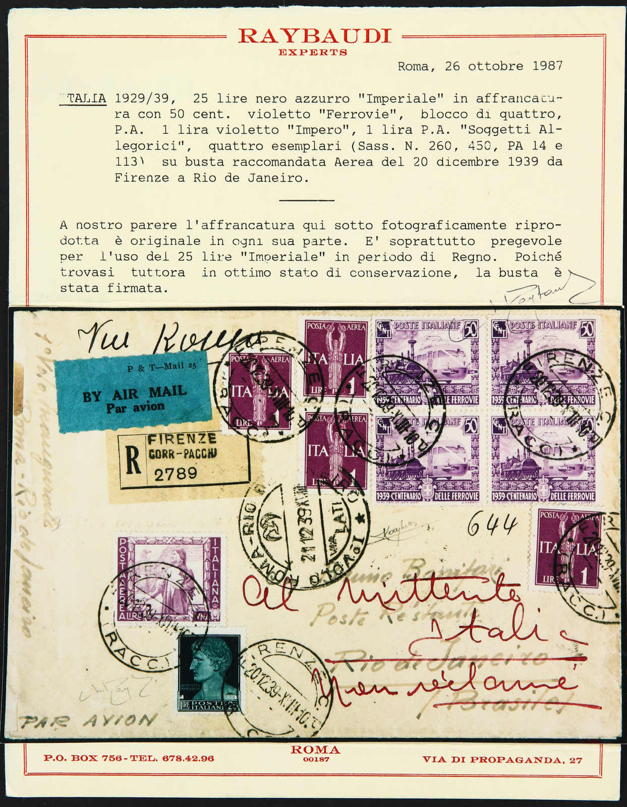 1939, first flight cover for the fly from Roma to Rio de Jenairo dated 21.12.1939 bearing very rare 1929/39 issue 25 lire, Sassone 260, sent registered from Firenze then redirected back to sender, cert. Raybaudi (Image) (imagea)