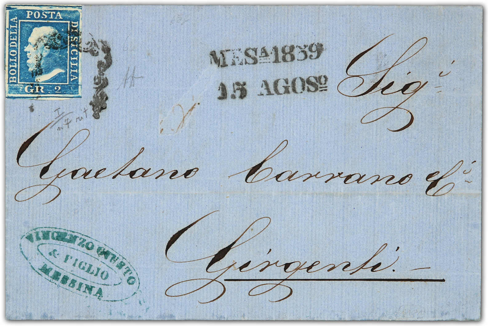 1859, entire letter from Messina to Girgenti bearing single franking Sicily issue 2 Gr., alongside double-straight line "Mes 1859 / 15 Agos" cachet, Sas. 2200 € (Image)
