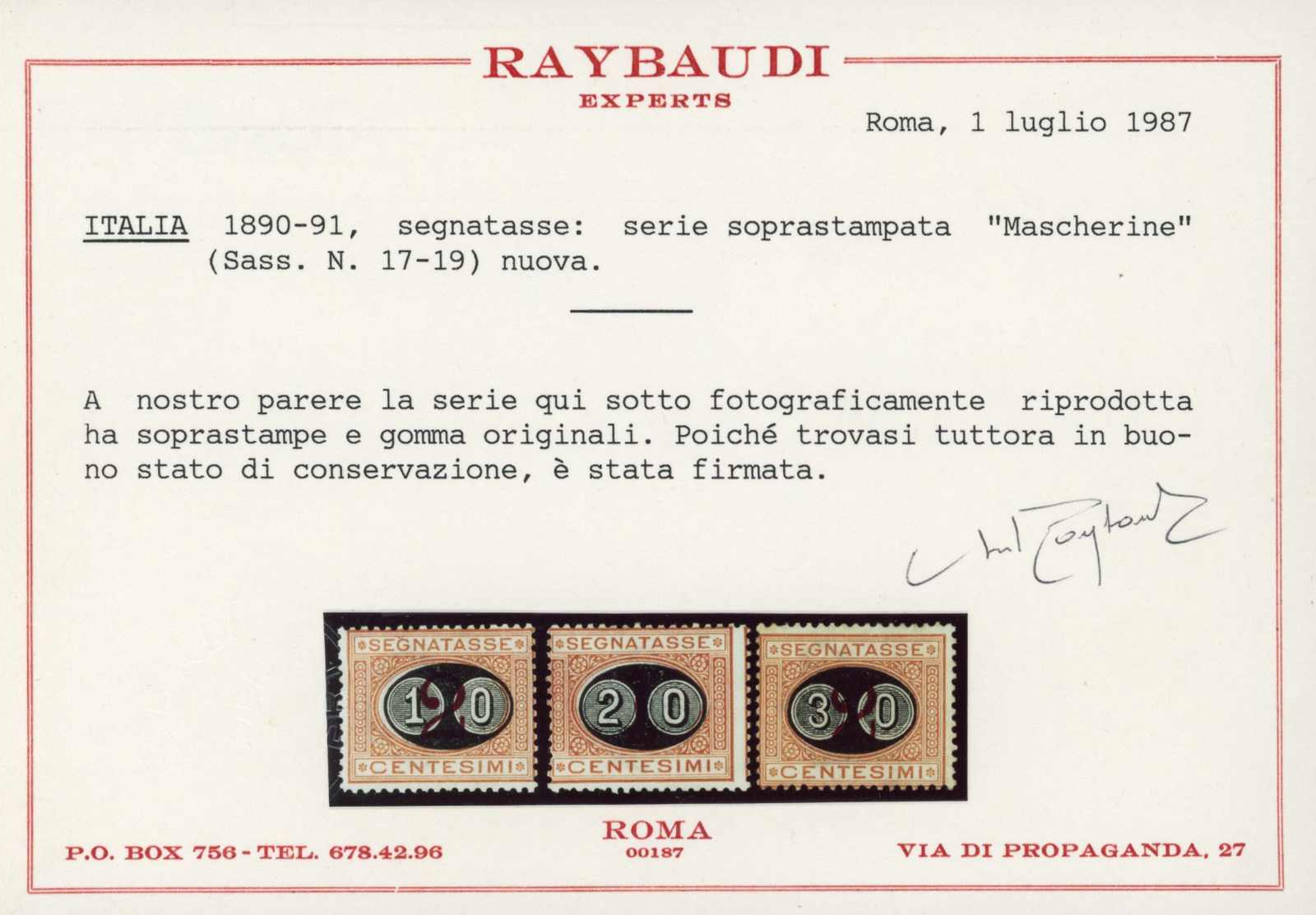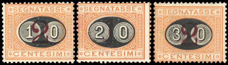 1890, 10 C. a. 2 C. bis 30 C. a. 2 C. orange/karmin, die kpl. Ausgabe von 3 ungebr. Werten, farbfrisch und üblich gezähnt, sign. A. D. und Fotobefund Raybaudi (ME 2.000,-) (Image) (imagea)