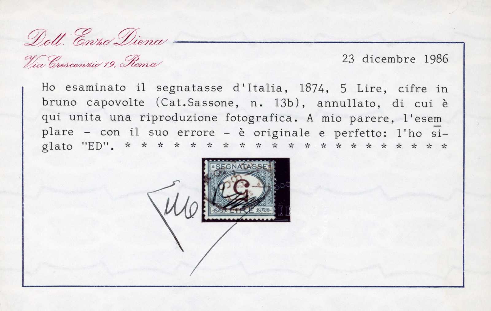 1870, 5 L. Ziffer blau/braun, gest. Einzelwert mit kopfstehender Wertziffer, farbfrisch und gut gezähnt, sign. und Fotobefund Enzo Diena, einwandfrei (ME 1.200,-) (Image) (imagea)