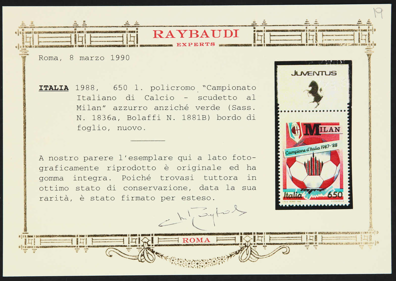 1988, Blue Milan, mnh, perfect, certificate Raybaudi (Image)
