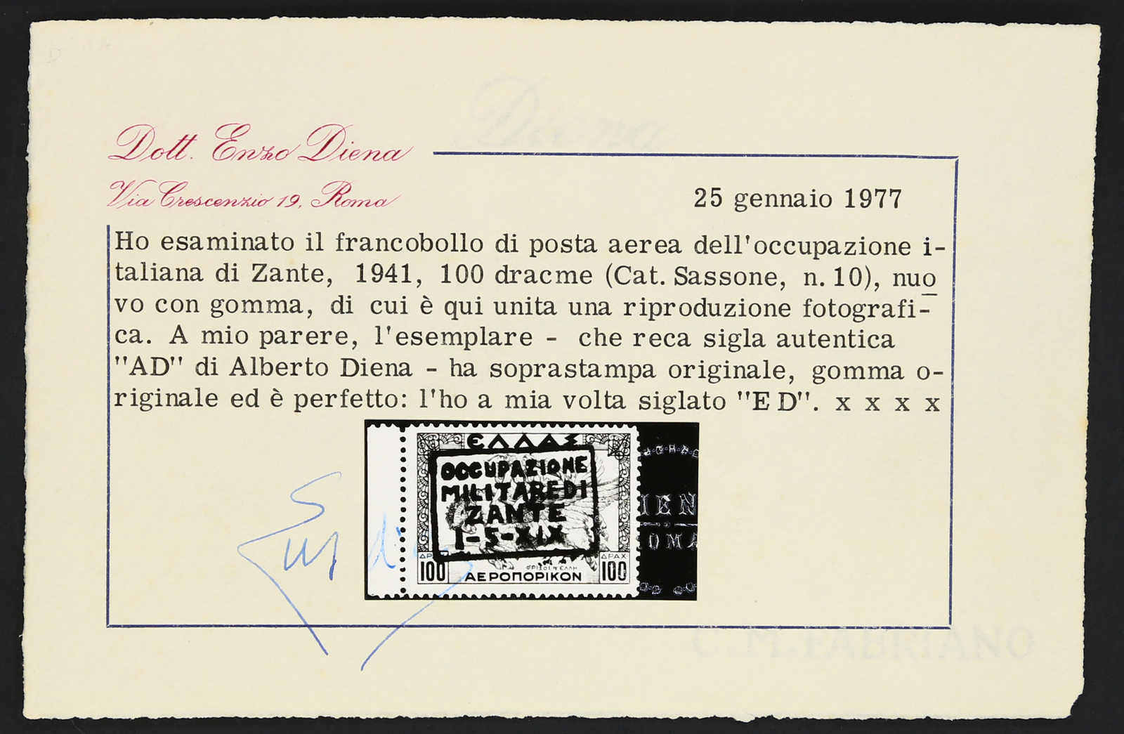 Zante, 1941, 100dr airmail, mnh, with left margin, perfect, probably the highest quality known, signed Alberto Diena, certificate Enzo Diena