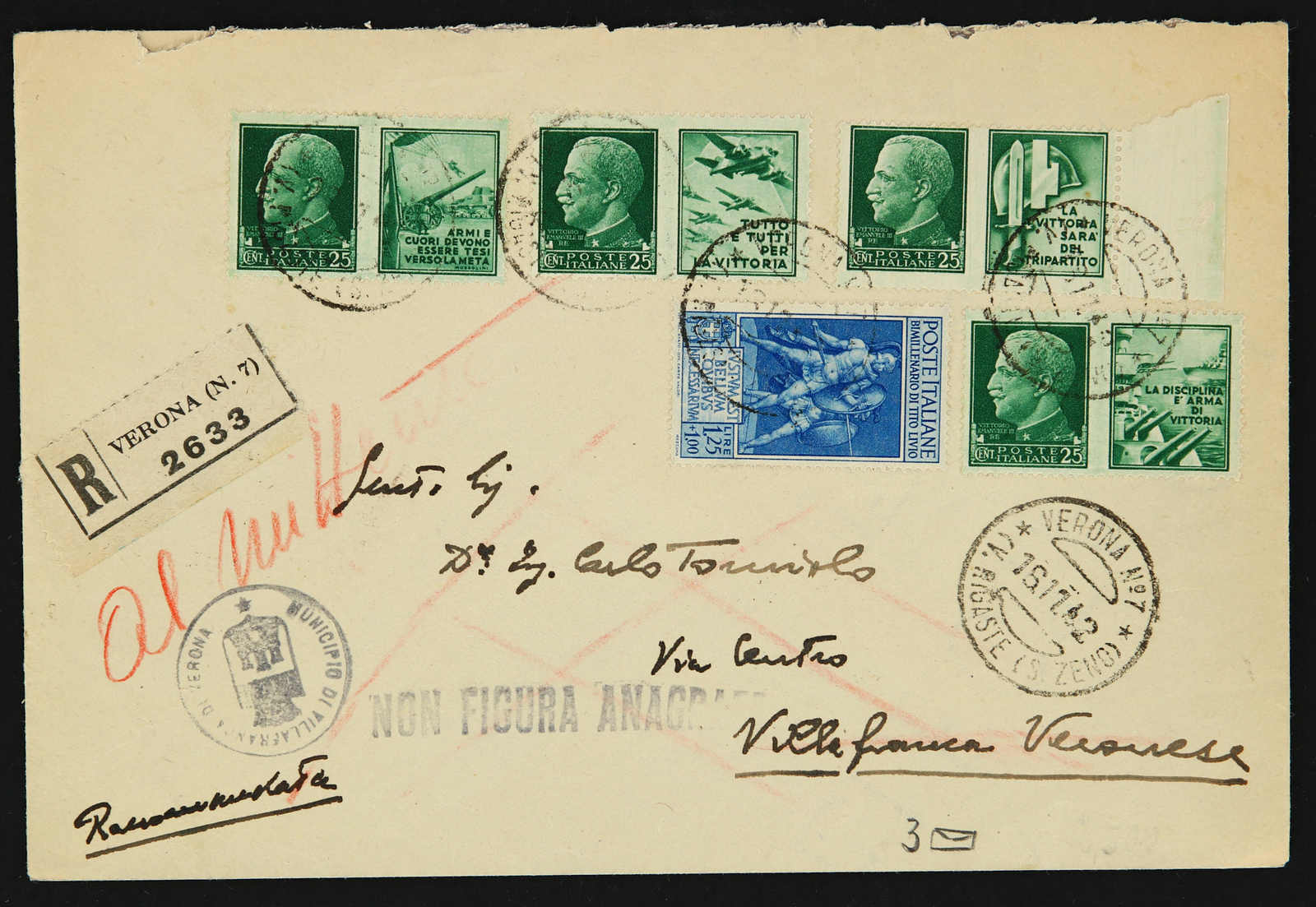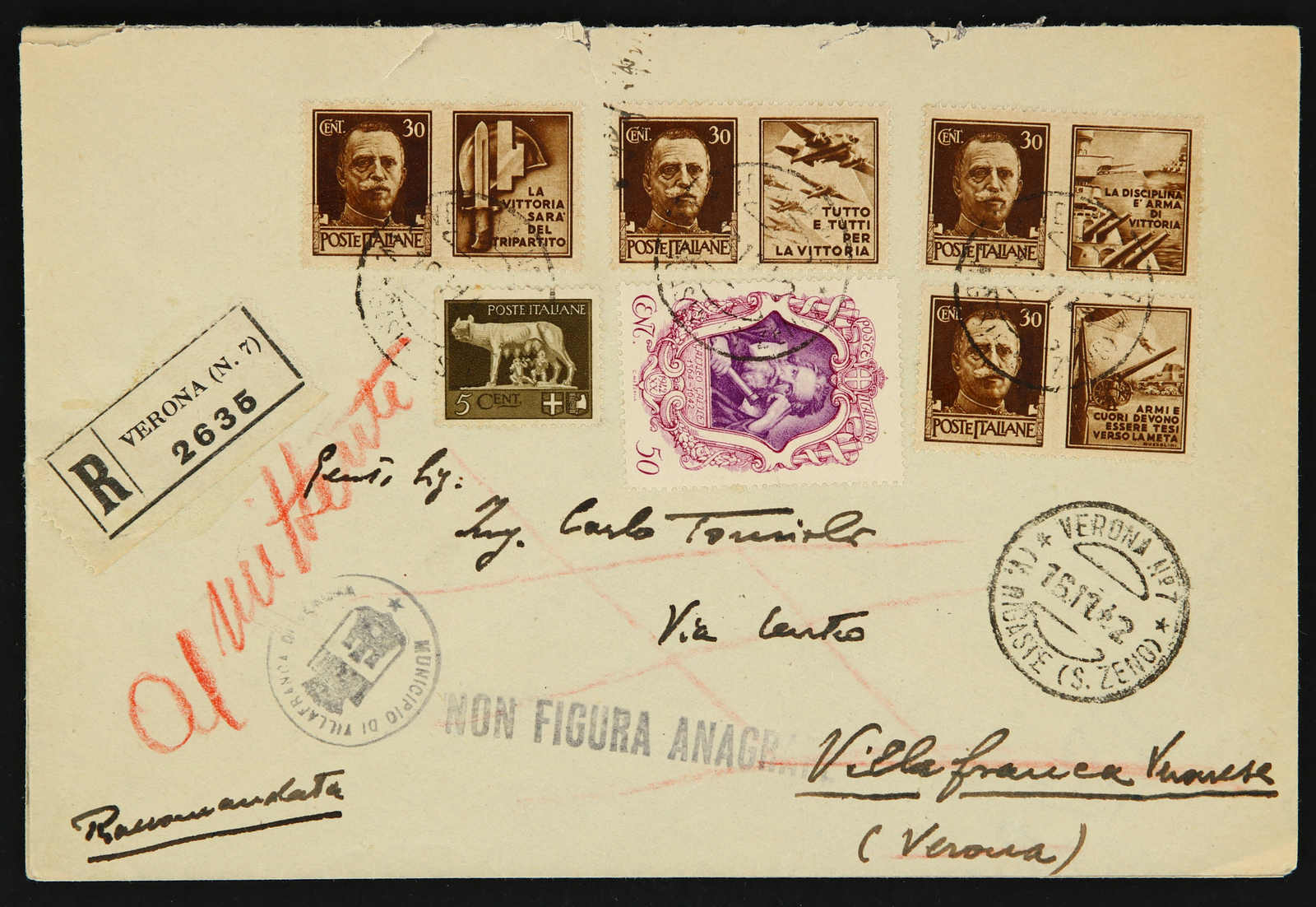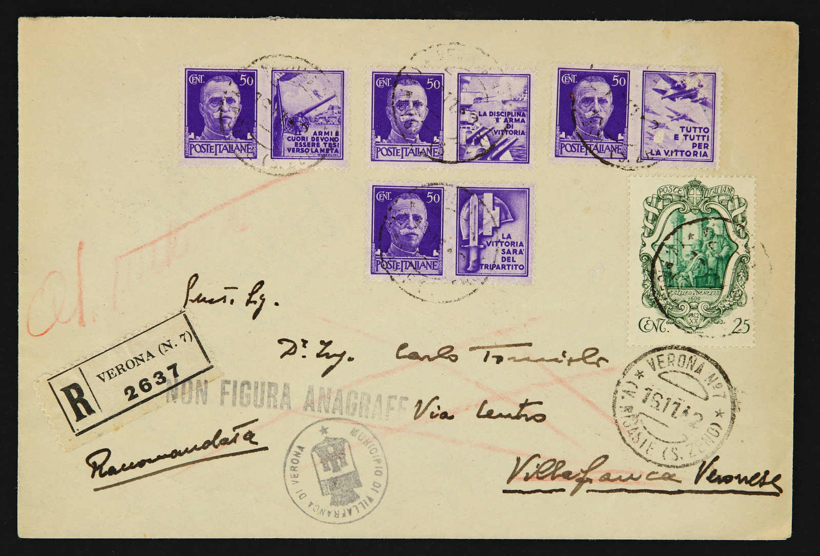 1942, propaganda issue stamps on three registered covers from Verona used with correct rate, Sassone 1-12 (Image) (imagea)