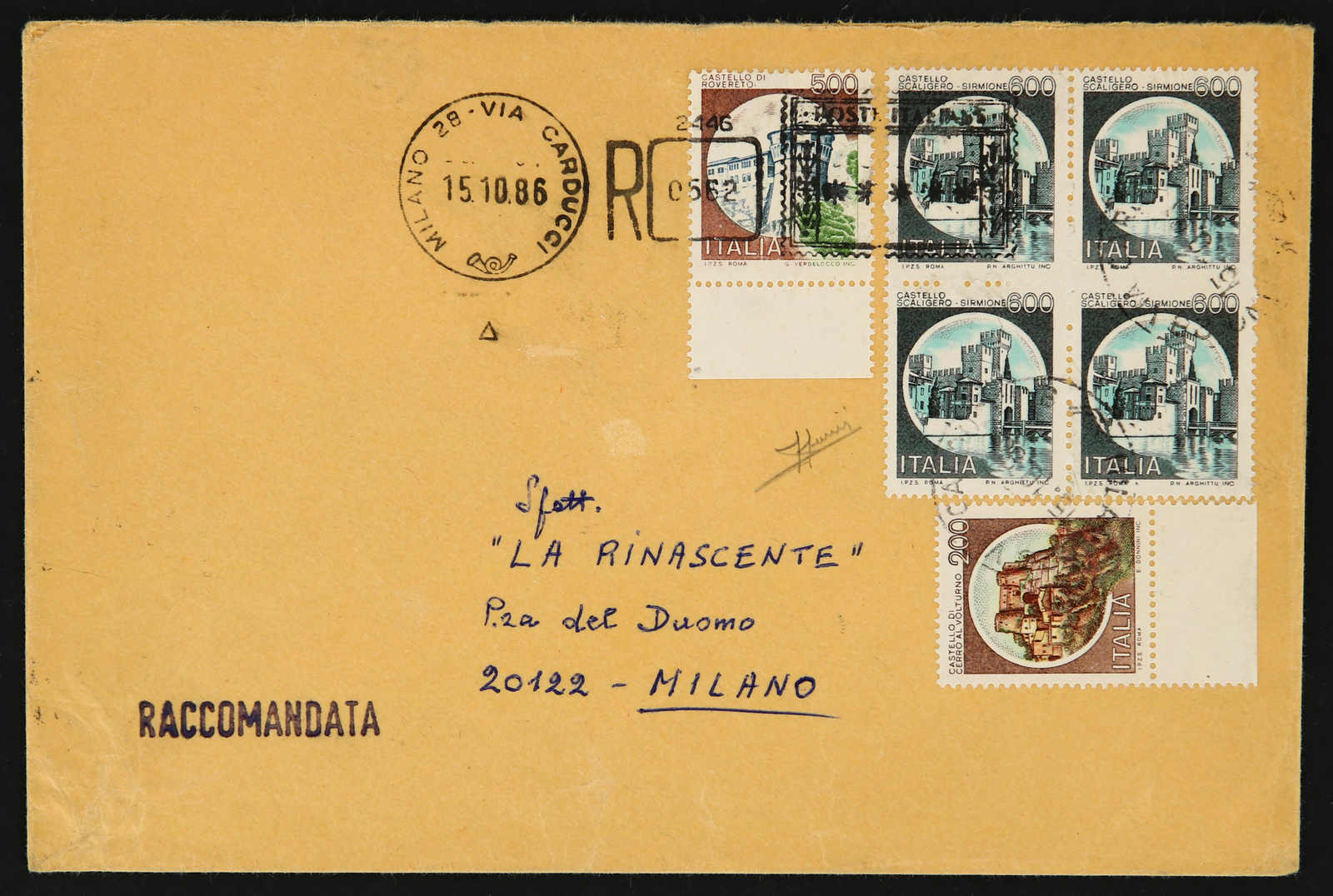 1980/92, definitives on registered cover used with Milano postmark, 200 Lire, 500 Lire and partly imperf block of four 600 Lire, Sassone 1516, a1522 and1523, signed Sorani (Image) (imagea)
