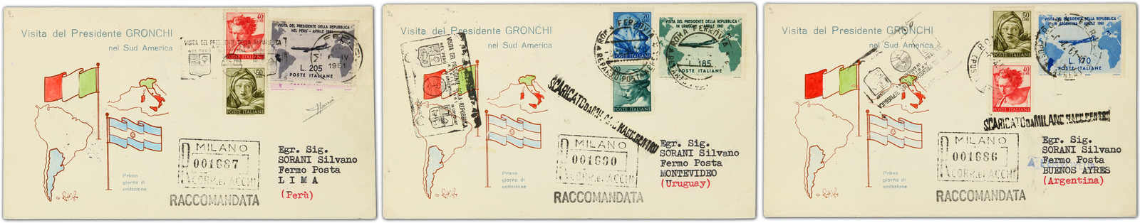 1961, President Gronchi's visit to Argentina-Peru-Uruguay, full set on three registered covers bearing the famous lilac pink / Gronchi Rosa, since it was discovered that this stamp was printed incorrectly before it was put into