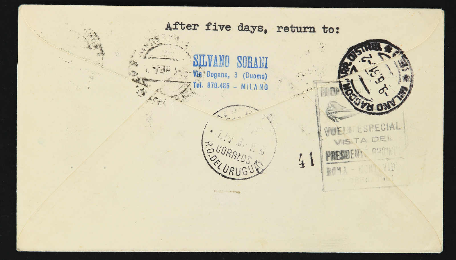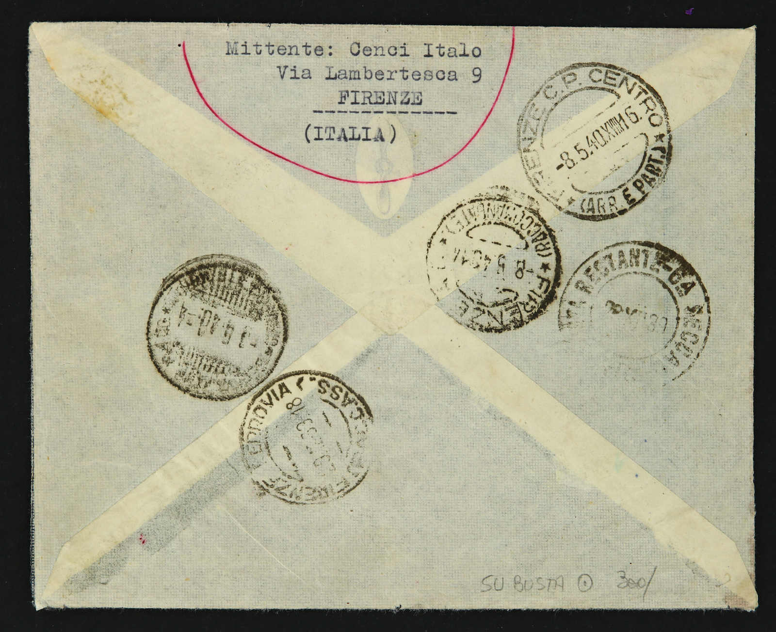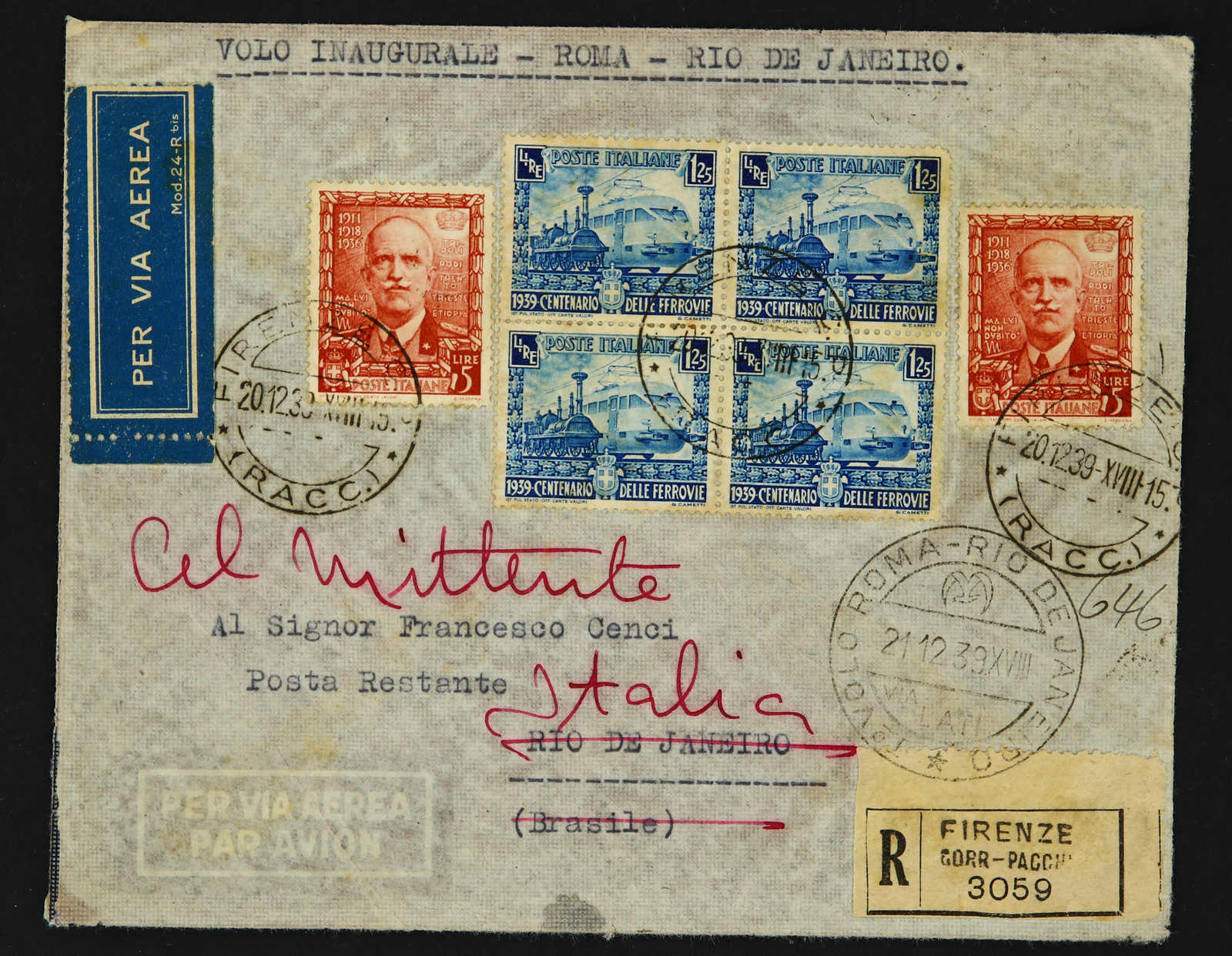 1939, Roma to Rio de Janeiro first fly 21.12.1939 registered cover sent from Firenze then returned to sender by multiple colour full franking