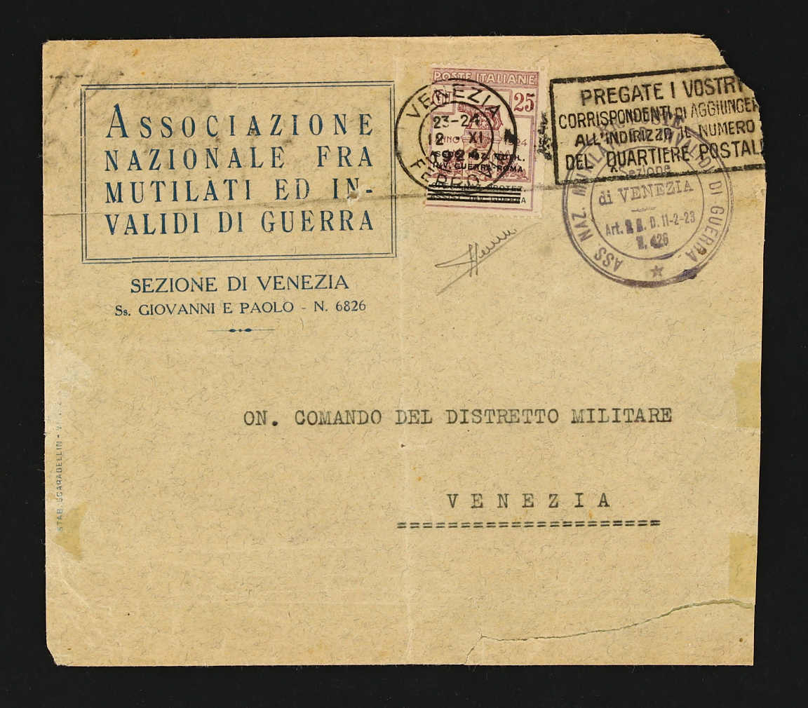1924, special mail stamp 25 cent on cover used from Venezia, Sassone 72, signed Sorani, cat:.850 € (Image)