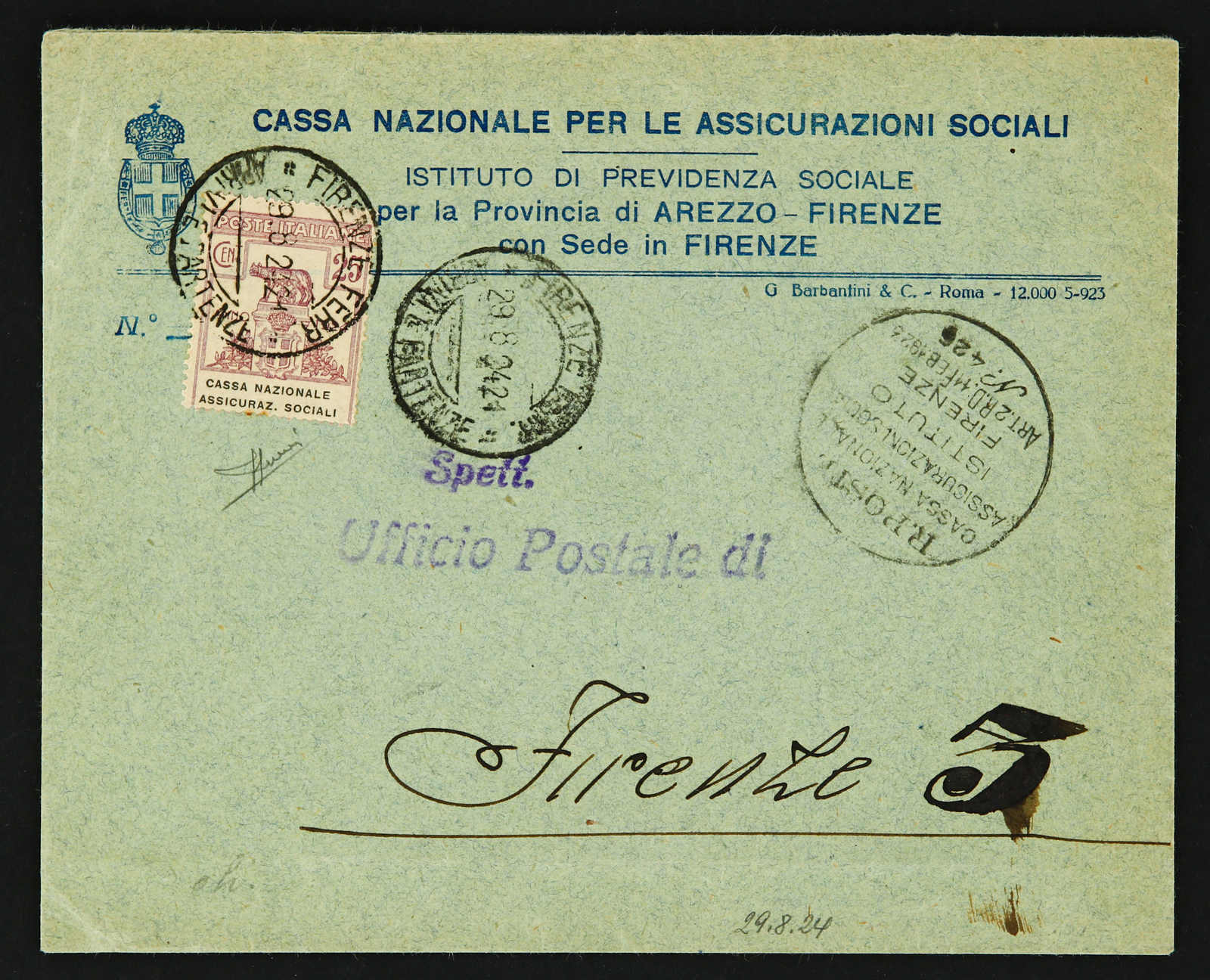 1924, special mail stamp 25 cent single franking on cover used from Firenze, Sassone 26, signed Sorani, cat 600 € (Image)