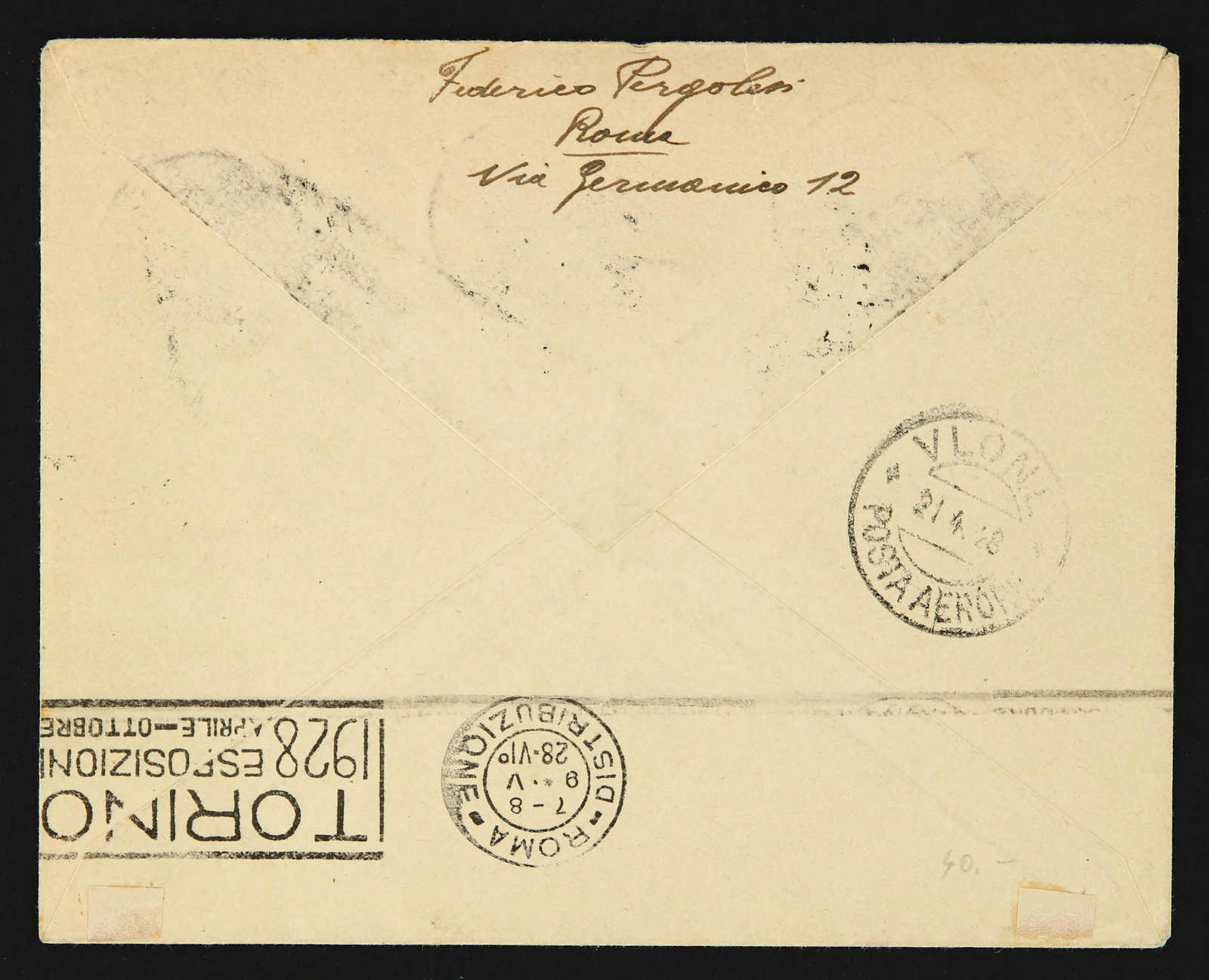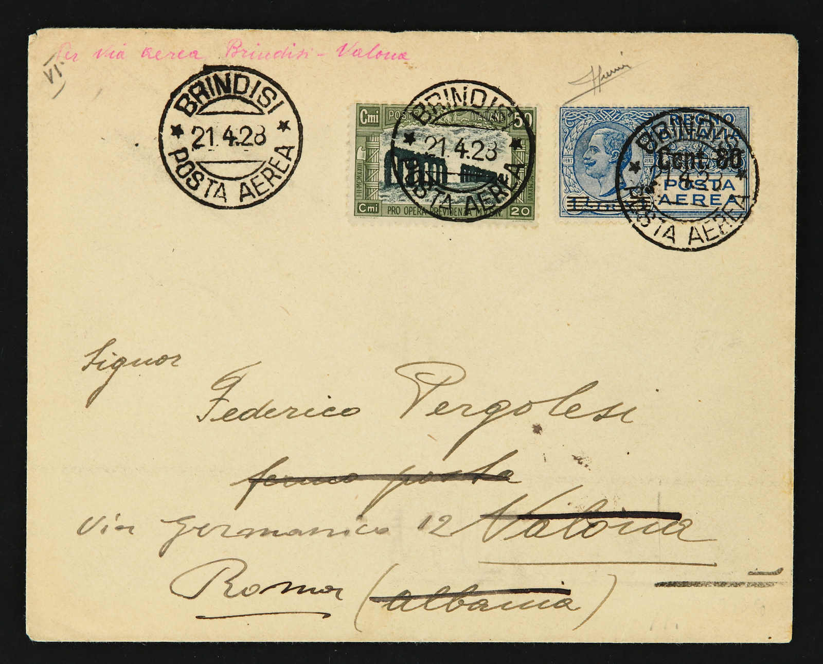 1928, Brindisi to Valona/Albania first fly cover dated 21.4.1928 then redirected to Rome (Image) (imagea)