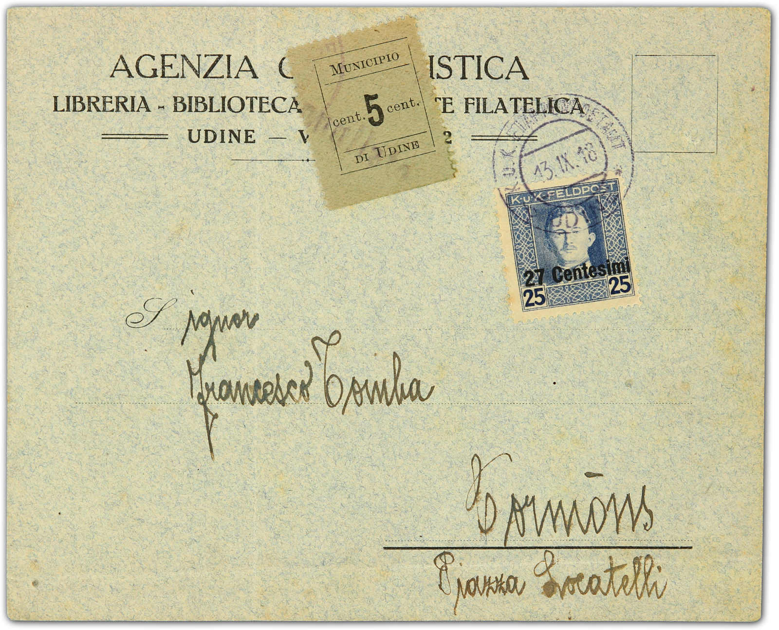 1918, cover bearing 27 cen. K.U.K. issue tied by "Udine" postmark, alongside showing very rare "Municipio di Udine 5 Cent" local stamp properly used, Sassone 1 (Image)
