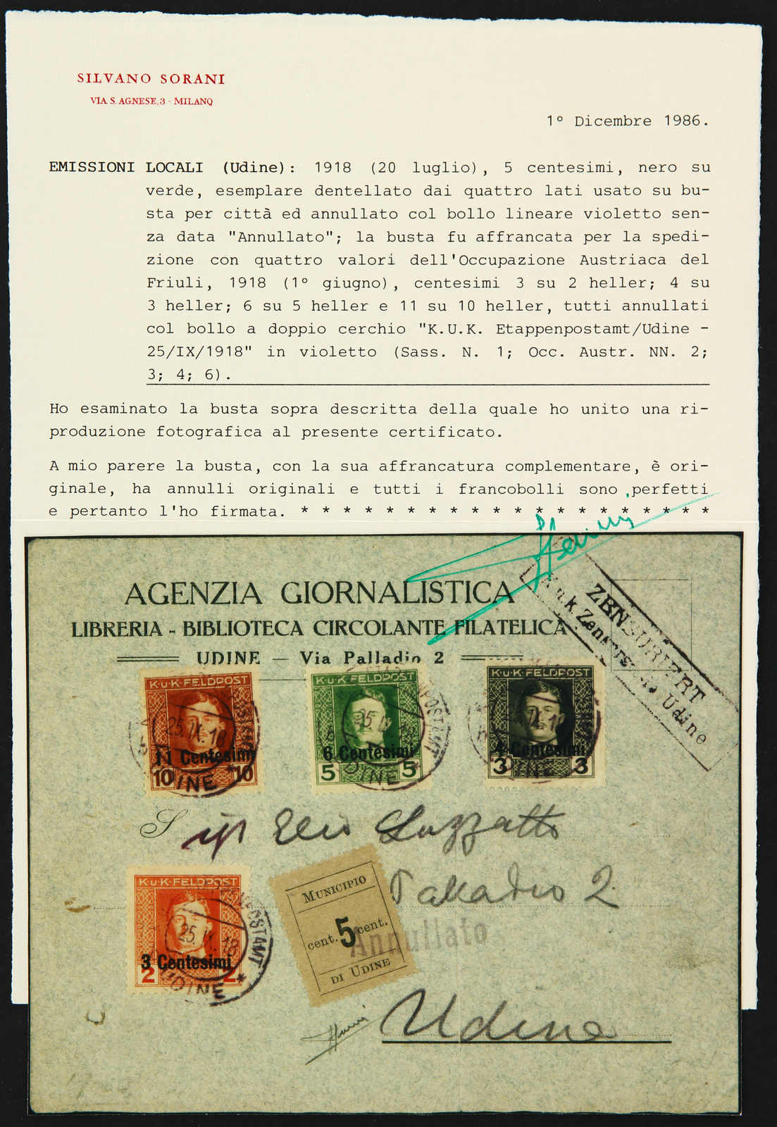 1918, cover bearing 11, 6, 4 and 3 cen. K.U.K. issue tied by "Udine" postmark, alongside showing very rare "Municipio di Udine 5 Cent" local stamp properly used and cancelled, alongside censor mark, Sassone 1, certificate S.Sorani (Image) (imagea)