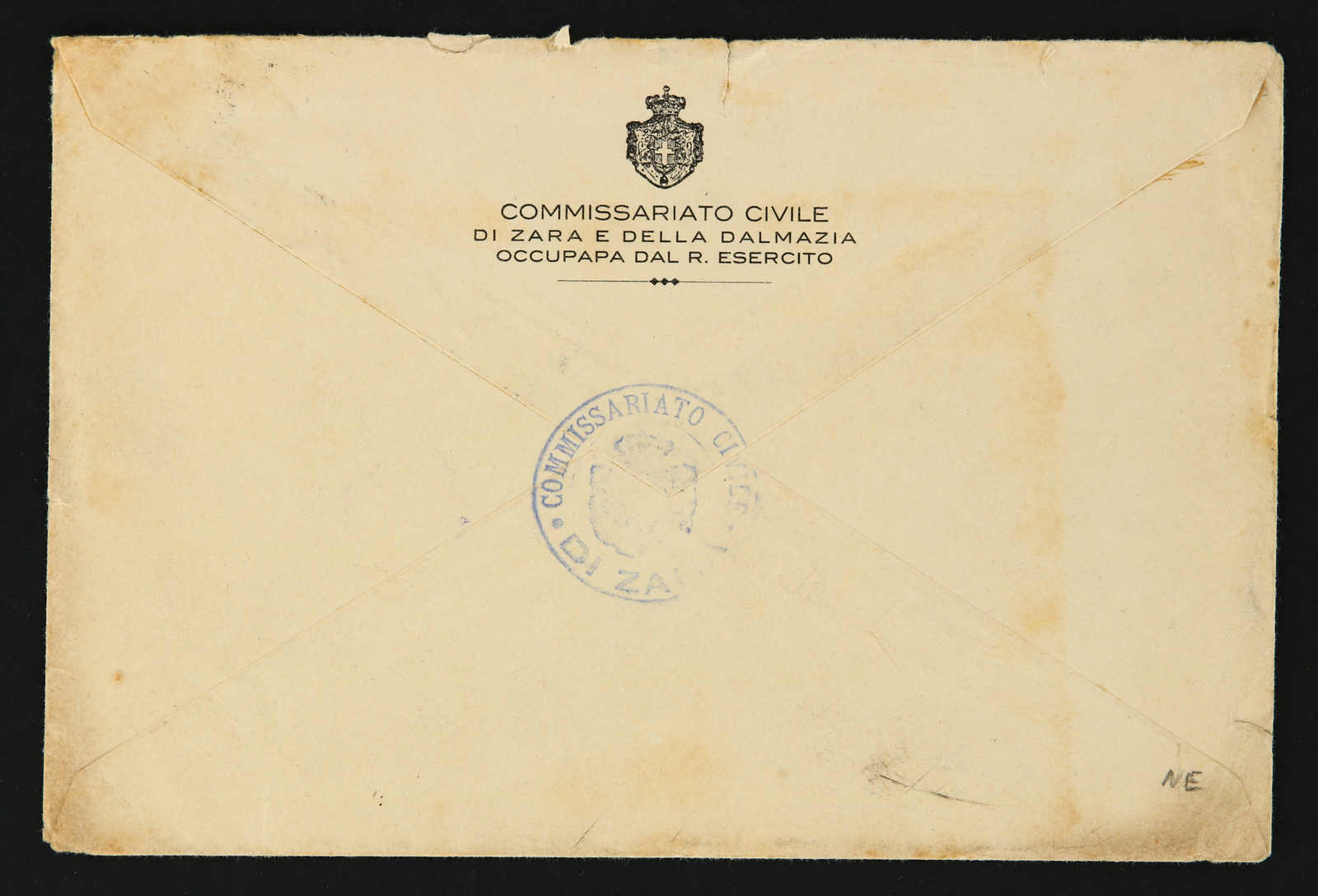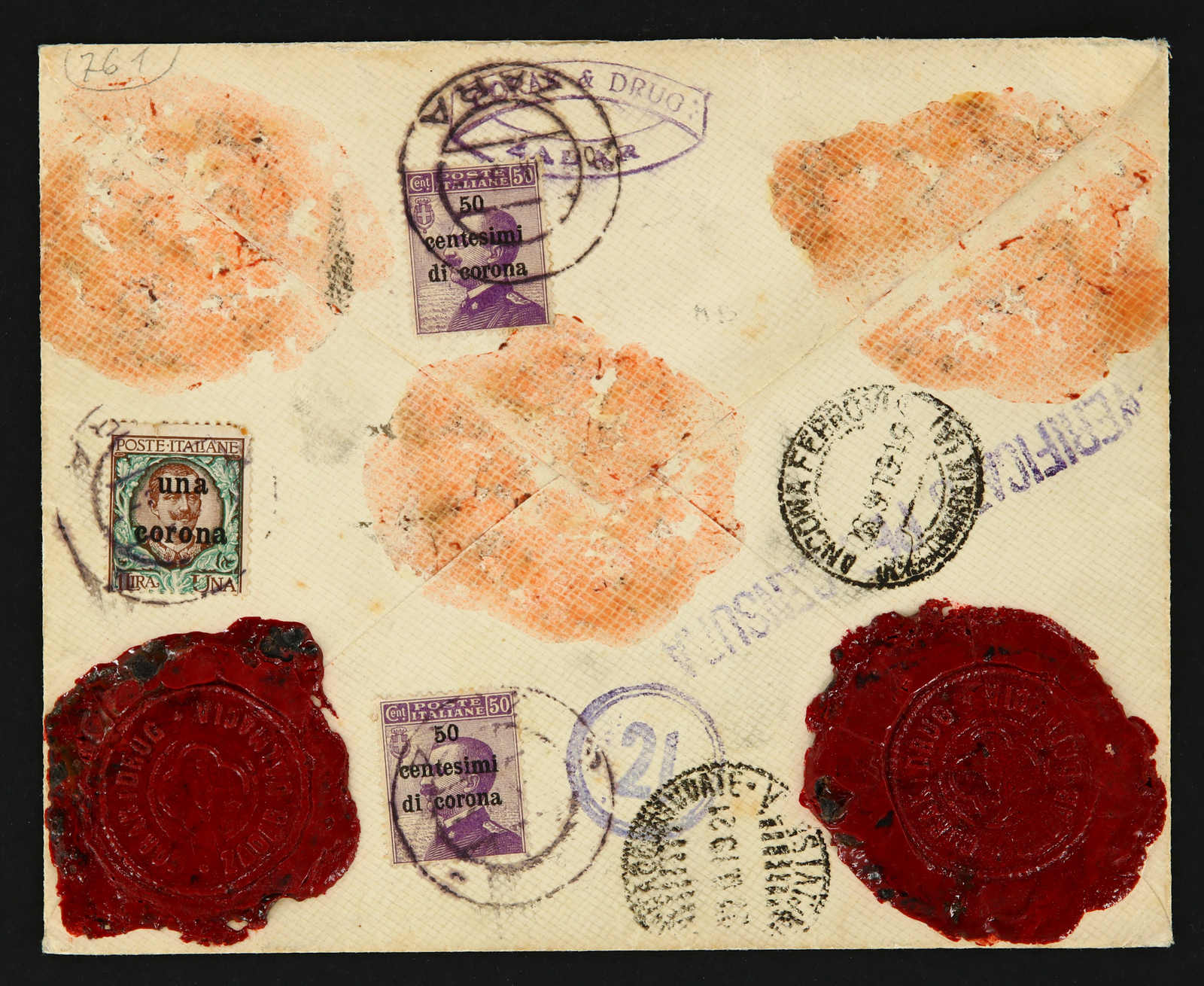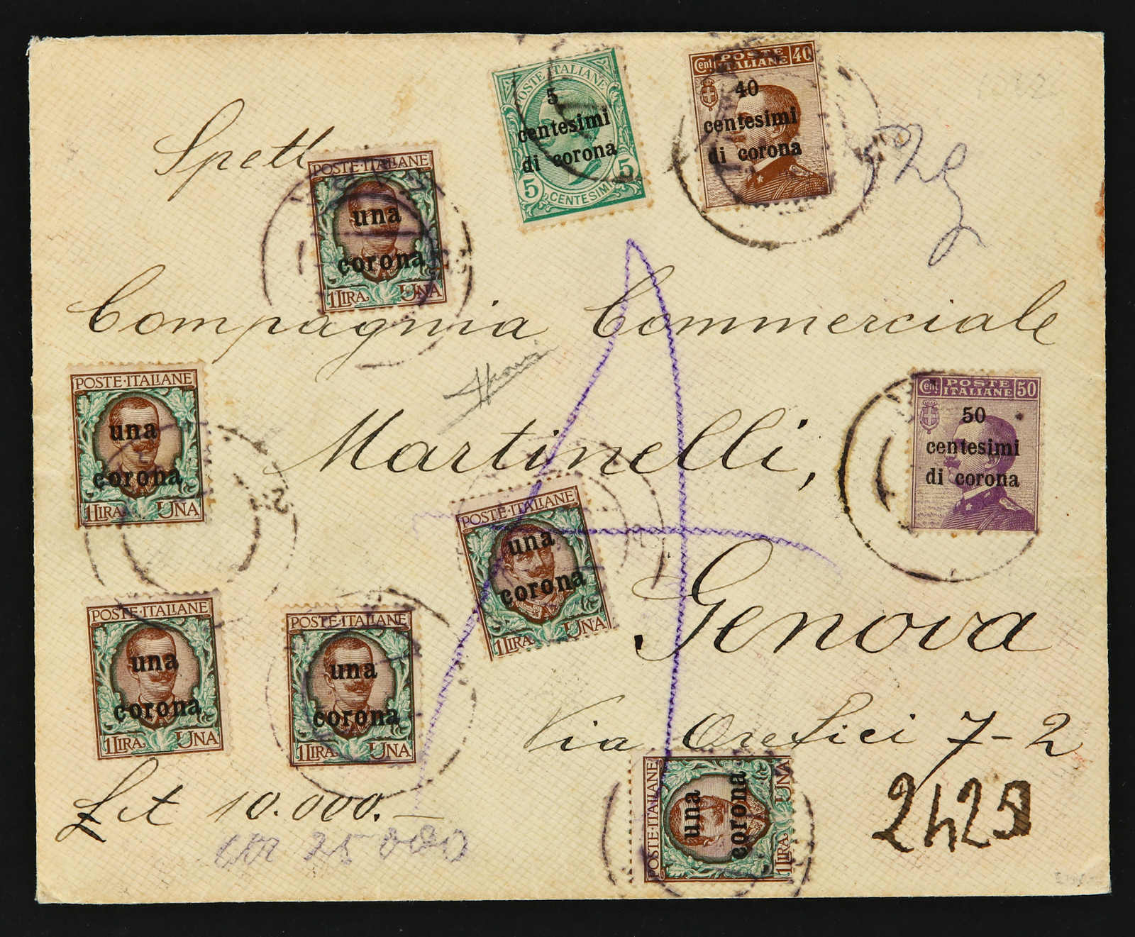 1919, Italian occupation of Dalmazia, insured cover of 10000 lire sent from Zara to Genova on 28.9.1919 bearing 7 stamps of 1 corona on 1 lire Dalmazia issue and three stamps of 50 c. on 50 c. and 40 c. on 40 c. as well as 5 c. on 5 cen.