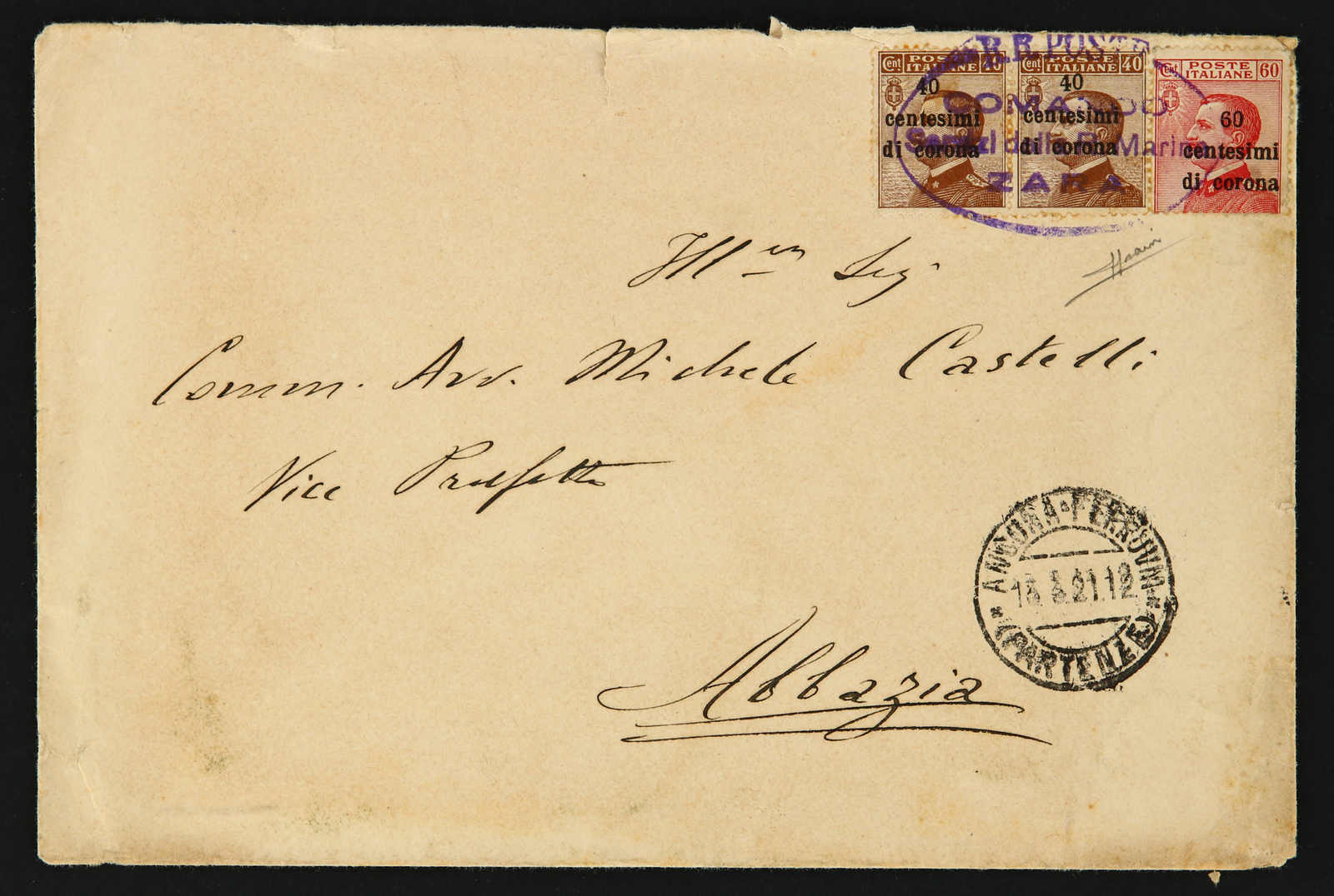 1921, commercially used cover sent during the Italian occupation from Zara to Abbazia bearing pair 40 cen. and 60 cen. tied by very clear large oval "R.R.Poste / Comando / servizi del Marine / Zara" cachet (Image) (imagea)