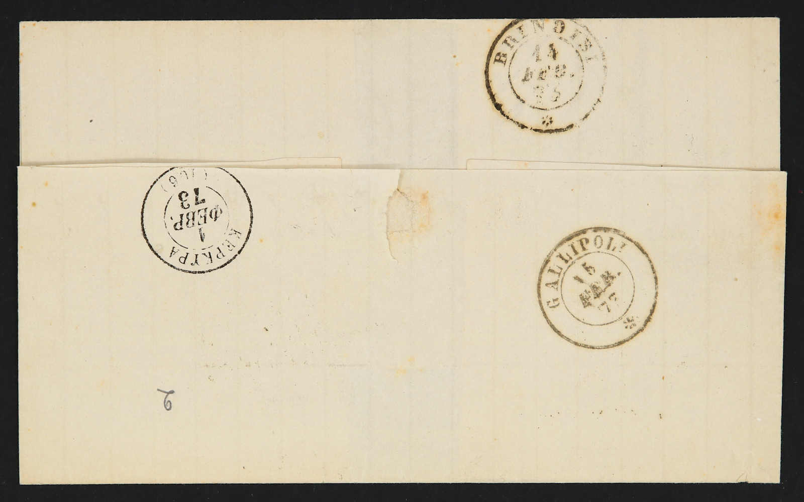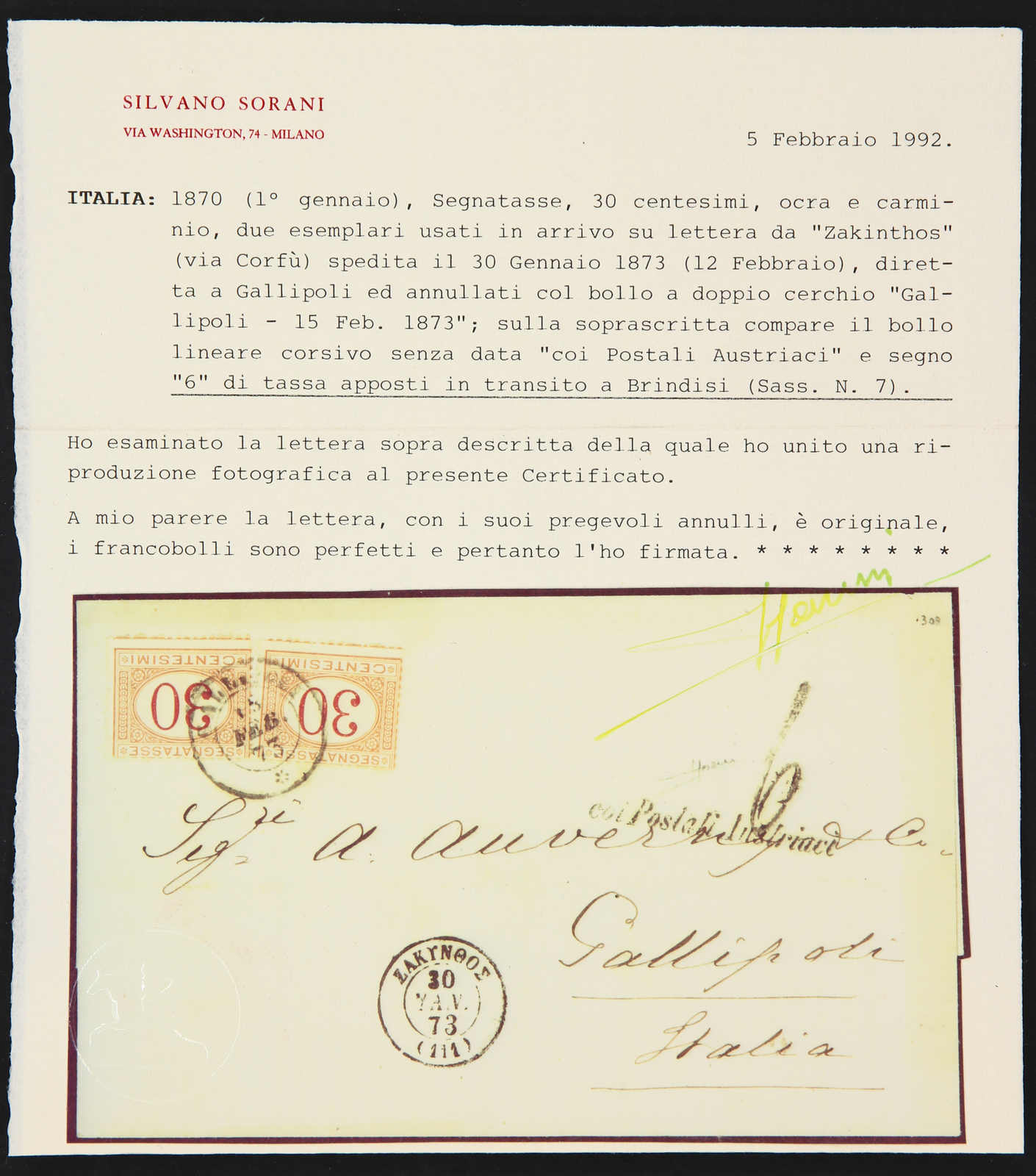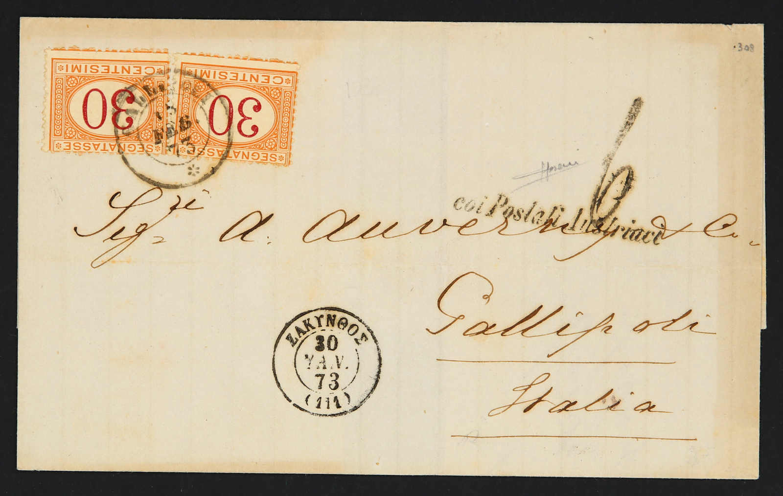 1873, entire letter from Zakynthos to Gallipoli/Italy showing all Greek "Zakynthos 30 Jan 73" cds, alongside "col Postali Austriaci" shipping line and "6" taxe cachet, on arrival 2x30 cent, postage due stamps applied, on reverse transit