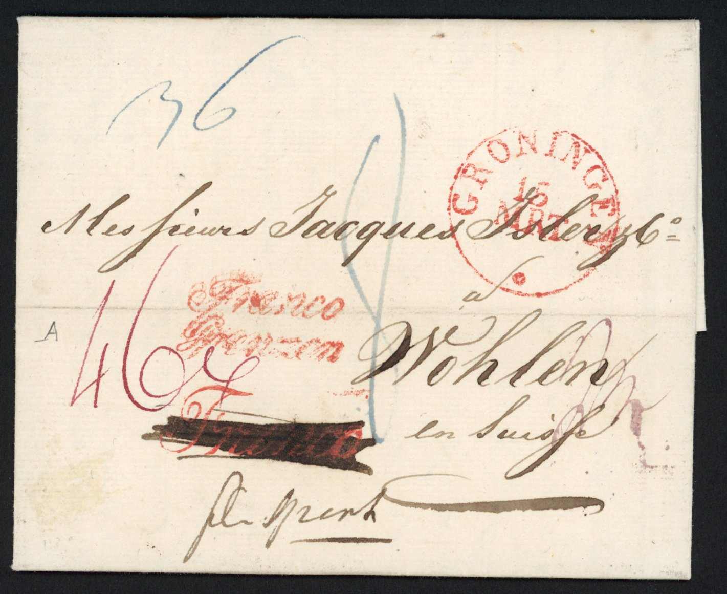 1833, Faltbrief ab "GRONINGEN 15 MRT" nach Wohlen/Schweiz, L1 "FRANCO" gestrichen, dafür L2 "FRANCO GRENZEN", mehrfach austaxiert, gute Qualität