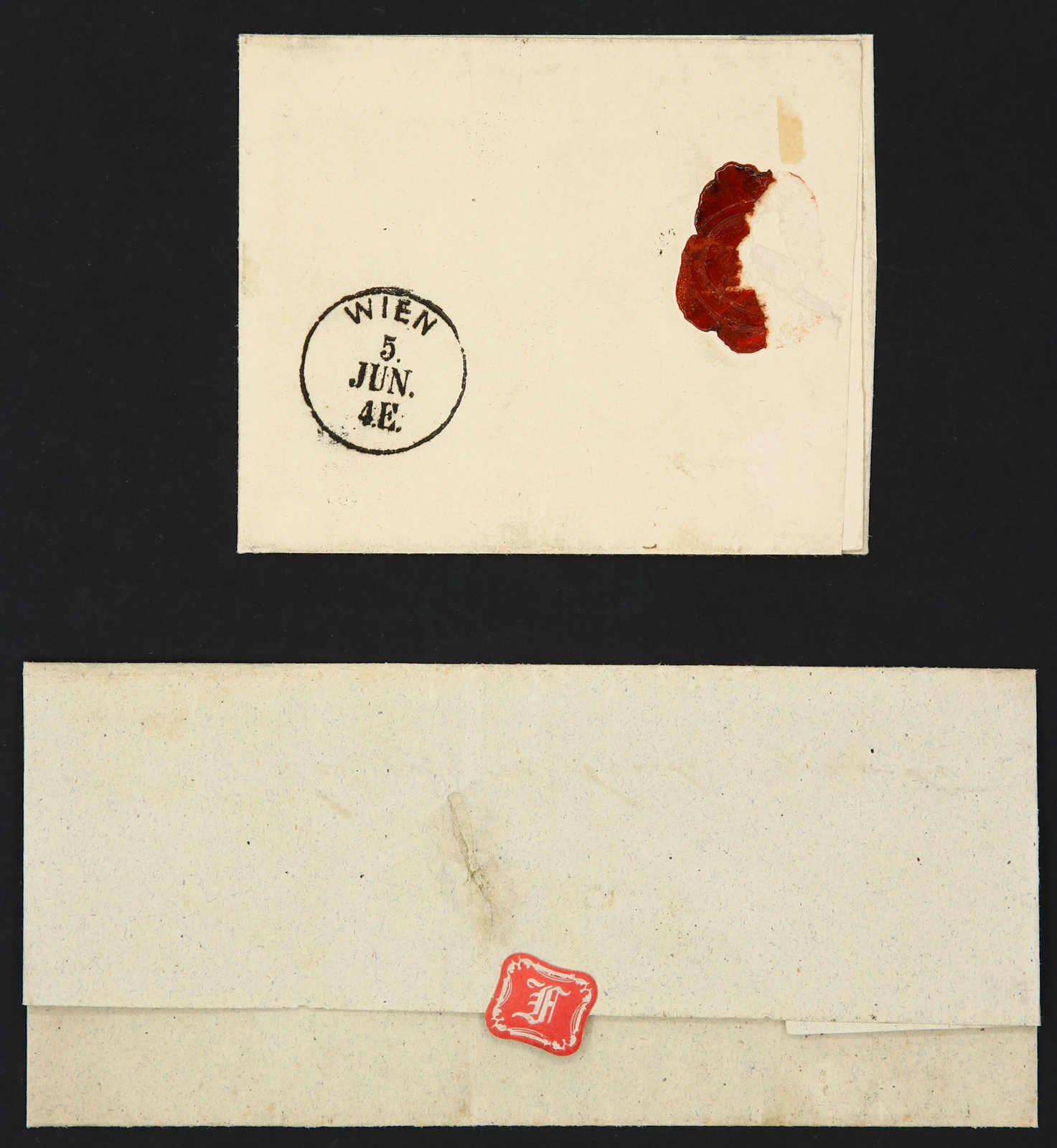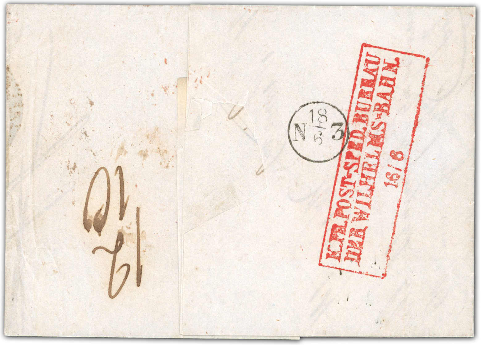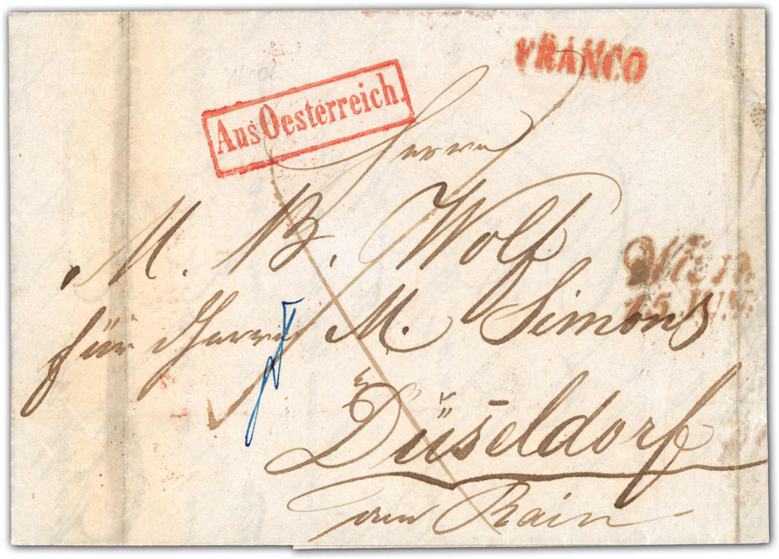 1850, Barfranko-Faltbrief vom 15.6. aus Wien (am 1.6. war Markenersttag) nach Düsseldorf, mit rotem Ra1 "Aus Oesterreich" und L1 "FRANCO", rückseitig roter Ra3 "K.PR.POST-SPED.BUREAU DER WILHELMS-BAHN 16/6", bis auf 2 senkr. Faltungen