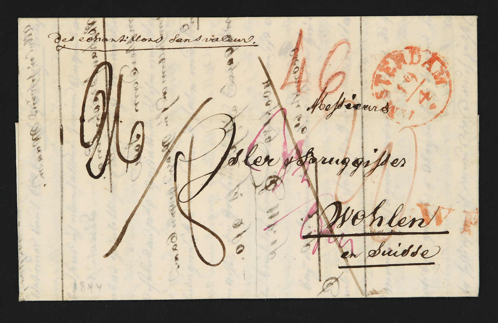 1844, Faltbrief Muster ohne Wert, handschriftl. "enchantillons sans valeur" ab "AMSTERDAM 19/4" nach Wohlen/Schweiz (Image)