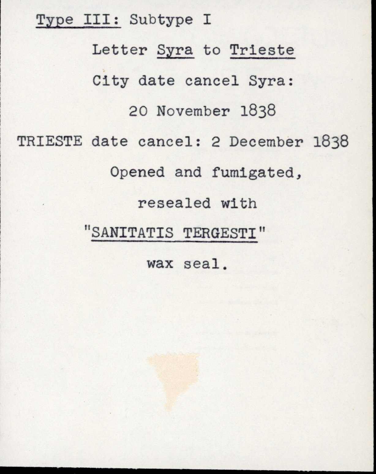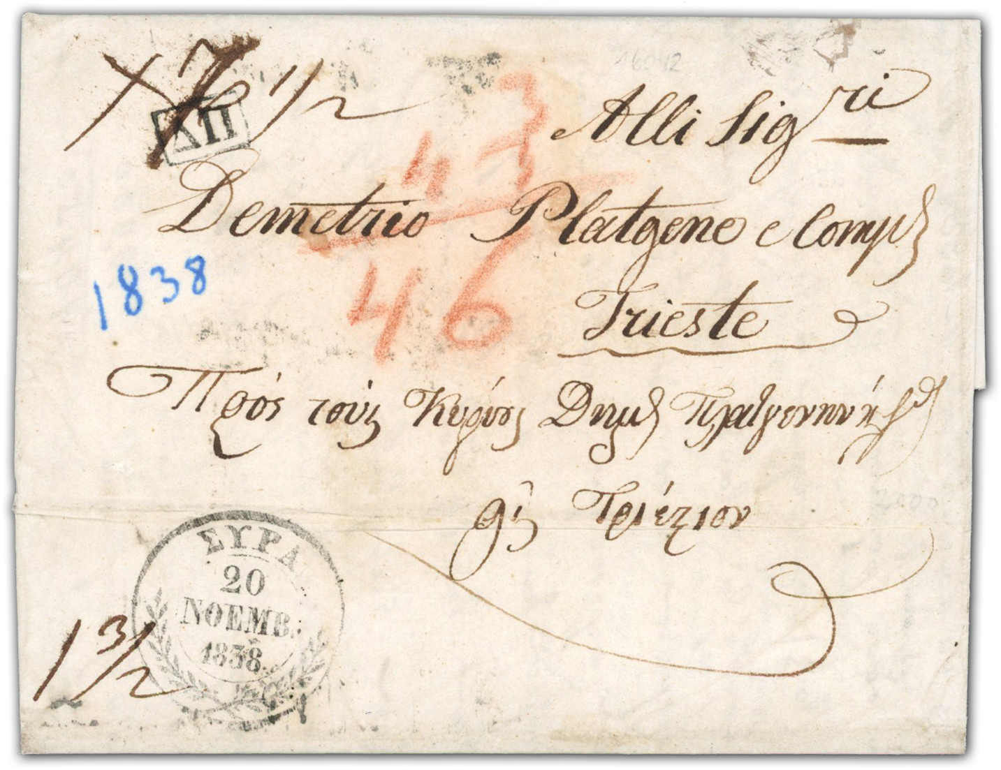 1838, Faltbrief mit komplettem Cholera-Siegel ab "SYRA 20 NOEMB. 1838" nach Triest, mit 46 Kr. taxiert (Image) (imagea)