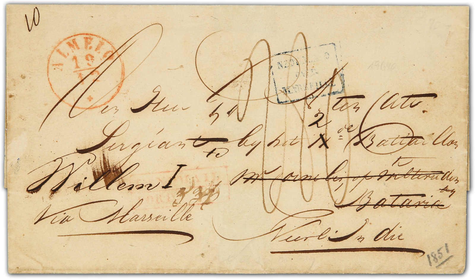 1851, Faltbriefhülle ab Almelo an einen Sergeanten beim 2. Bataillon bei Batavia/Niederländisch-Indien, nachgesandt, schwacher roter Ra2 "LANDMAIL PORT" mit handschriftl. "336" und blauer Ra3 "NEDERLAND VIA MARSEILLE" (Image)