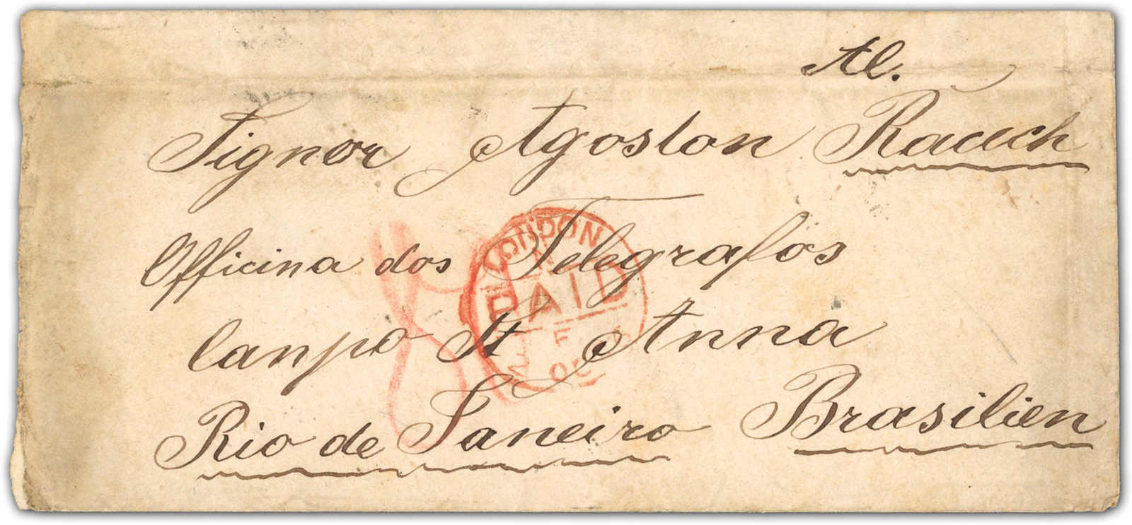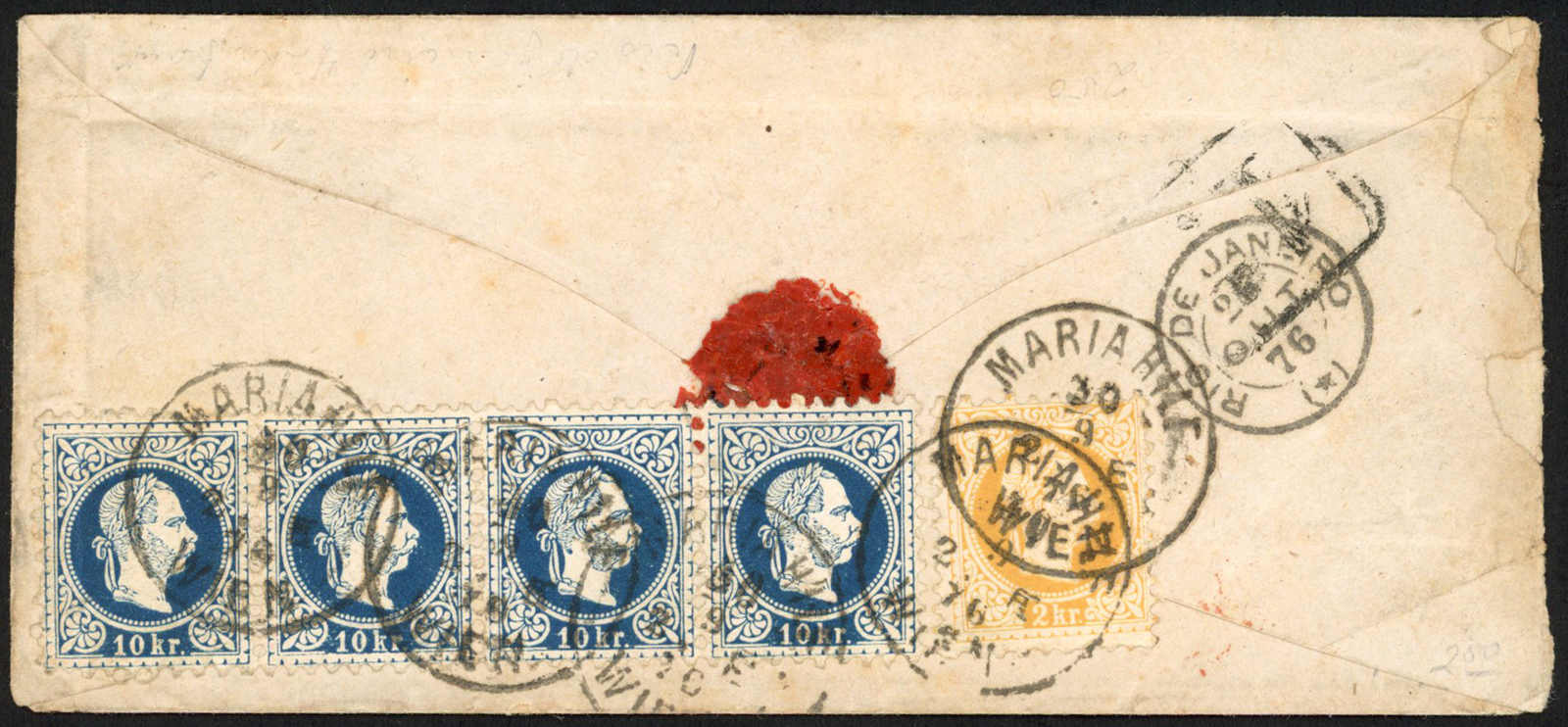 1876, 2 Kr. und waagerechter Viererstreifen 10 Kr. Franz Joseph im groben Druck als rückseitige Frankatur auf Brief ab "MARIAHILF 30/9 76" über London (roter "PAID"-Stempel) nach Rio de Janeiro, Ankunftsstempel, Marken in guter Qualität,