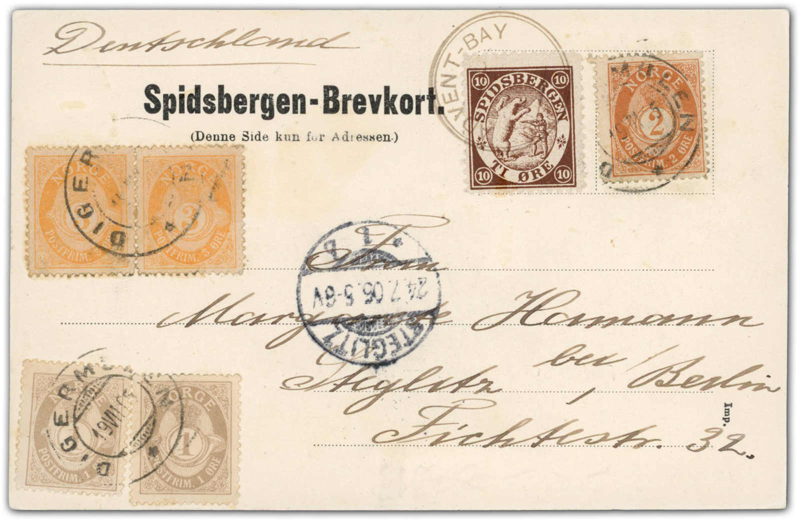 1905, Spitzbergen-Postkarte frankiert mit 10 Ø. braun von Spitzbergen, aufgegeben "ADVENT-BAY" ohne Datumsangabe und norweg. Zusatzfrankatur Mi-Nr. 52 (2), 53 und 54 (2) Posthorn, entwertet "DIGERMULEN 19.VII.05", adressiert nach Steglitz