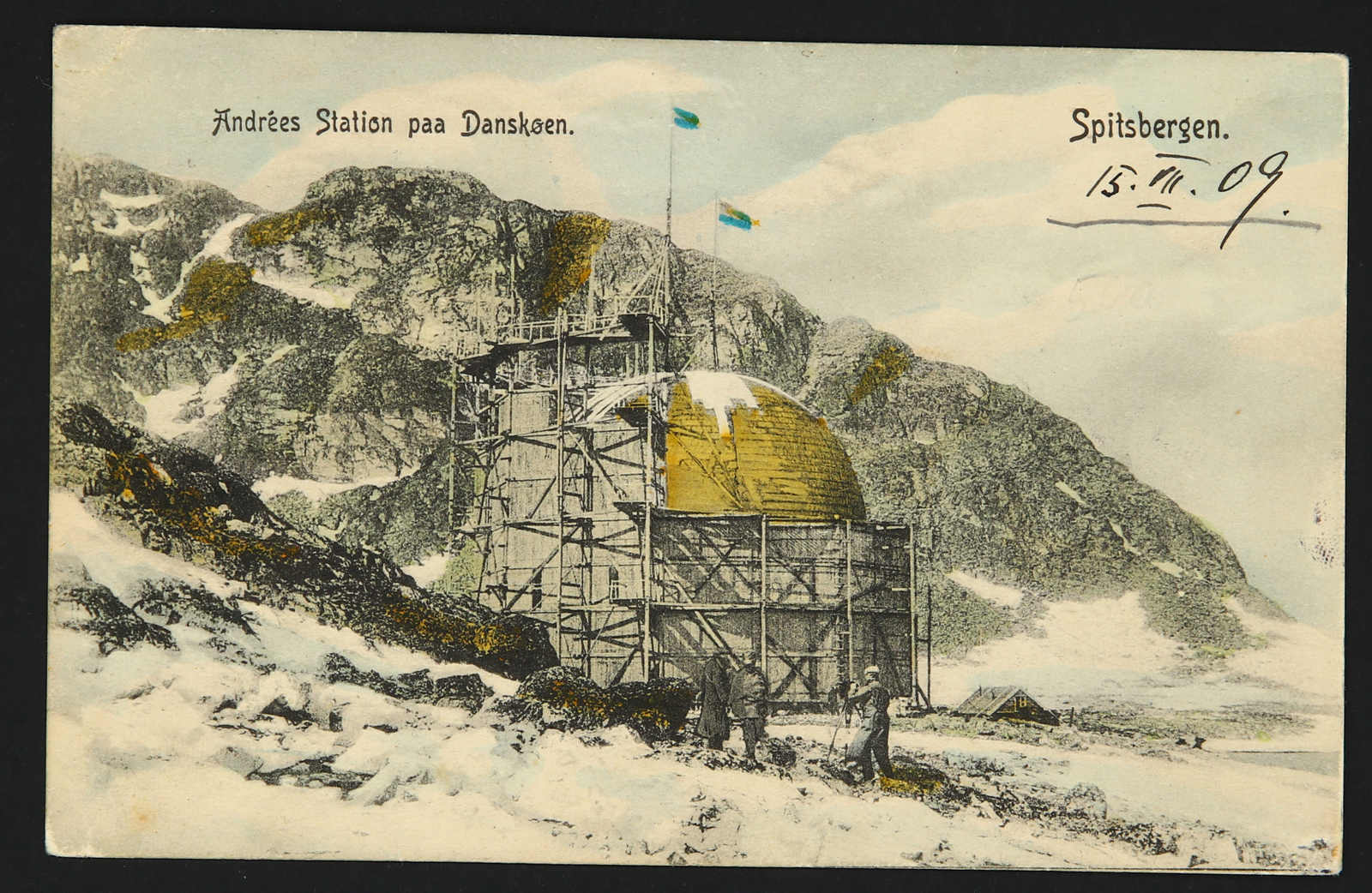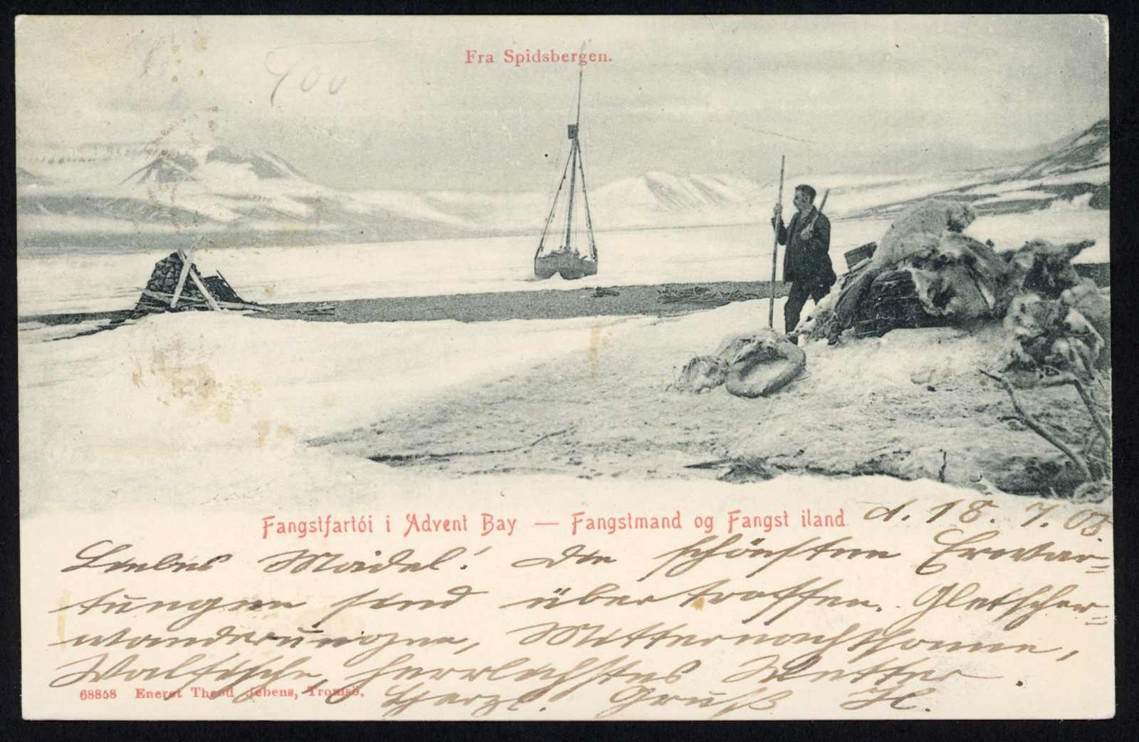 1909, 10 Ø. Posthorn karmin auf "SPITZBERGEN-POSTKARTE" mit zwei zusätzlichen Spitzbergen-Vignetten von Norwegen, entwertet mit DKr. "HAMMERFEST 19. VII. 09" und einer Vignette des "Österreichischen Lloyd", entwertet mit L2
