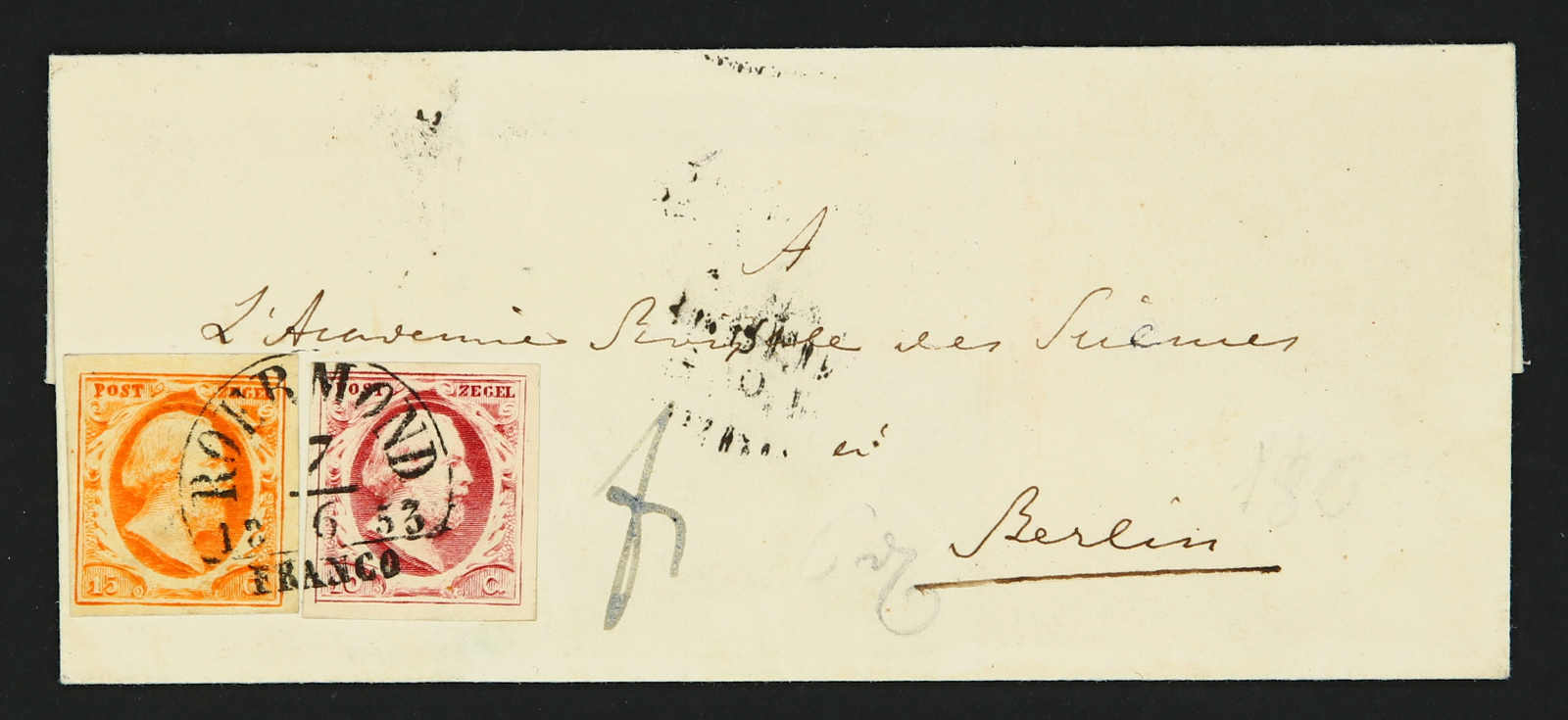 1853, 10 C. König Wilhelm III. karminrosa und 15 C. König Wilhelm III. orange auf kl. gesiegelter Faltbriefhülle, aufgegeben "ROERMOND 7/6 1853", adressiert nach Berlin, die Frankatur ist farbfrisch, vollrandig geschnitten und übergehend