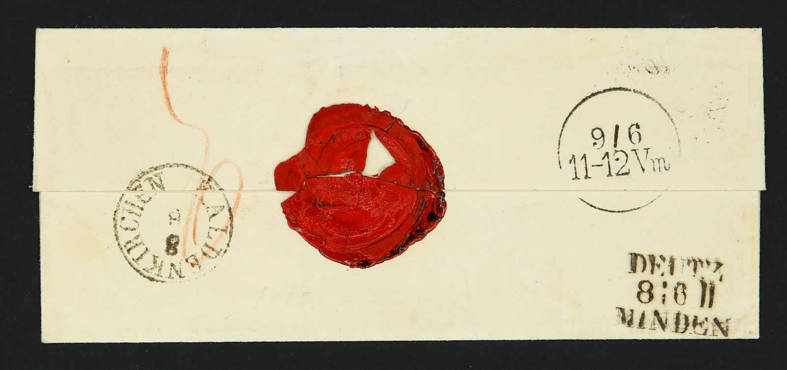 gest., rückseitig Durchgangsstp. "KALDENKIRCHEN", der preuß. Bahnpoststp. "DEUTZ-MINDEN 8 6" und der Ankunftsstp. vom 9.6, einwandfrei (Image) (imagea)