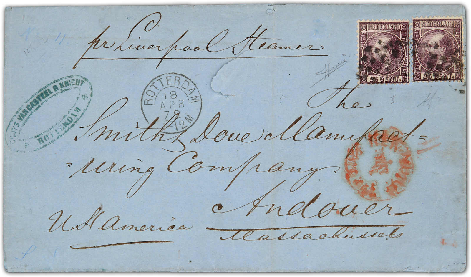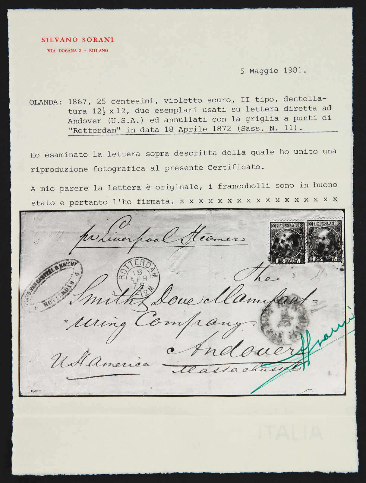 1872, entire letter sent from Rotterdam to Andover/Massachusses USA bearing two 25 cent dark violet stamps tied by dotted postmarks, alongside Rotterdam and red US arrival cds, certificate Sorani (Image) (imagea)