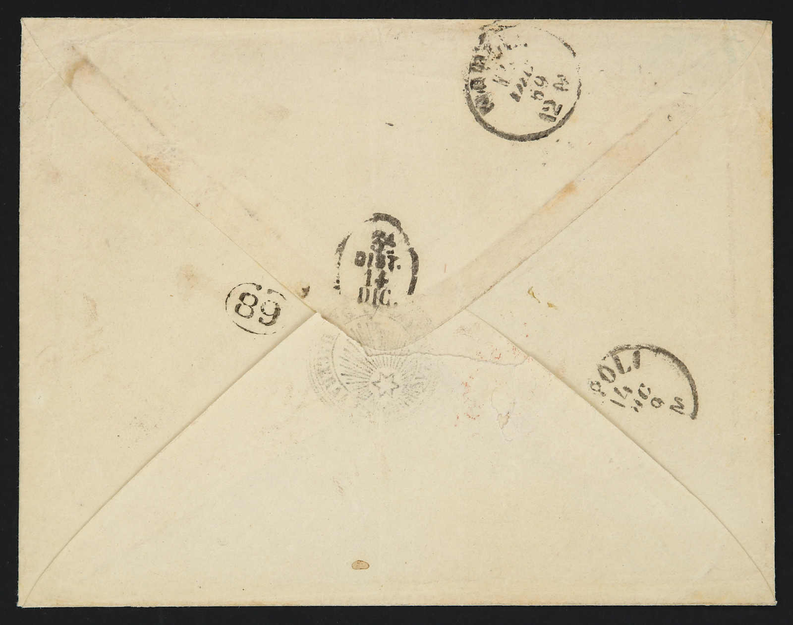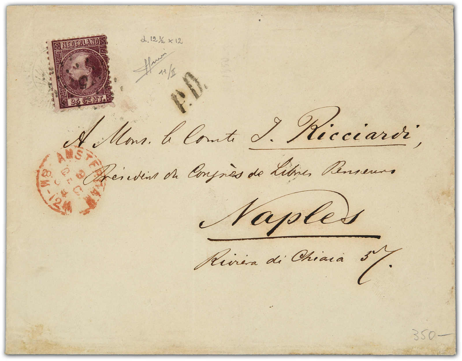 1869, cover sent from Amsterdam bearing single franking of 25 cent dark violet tied by dotted postmark sent to Naples / Italy (Image) (imagea)