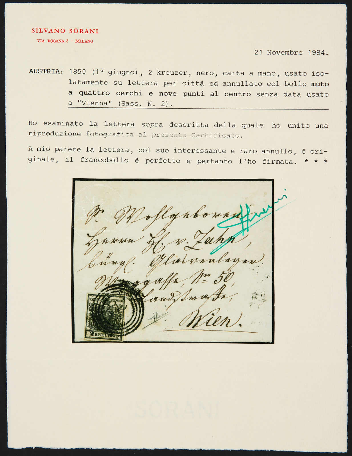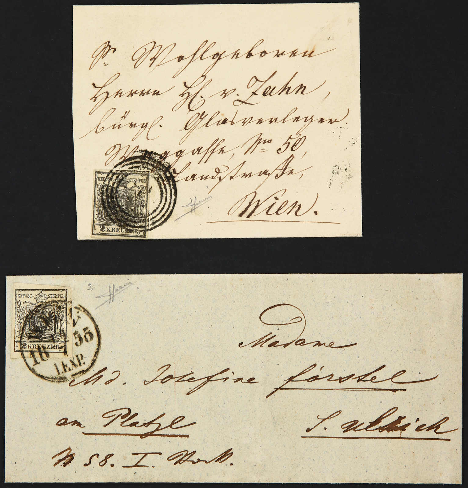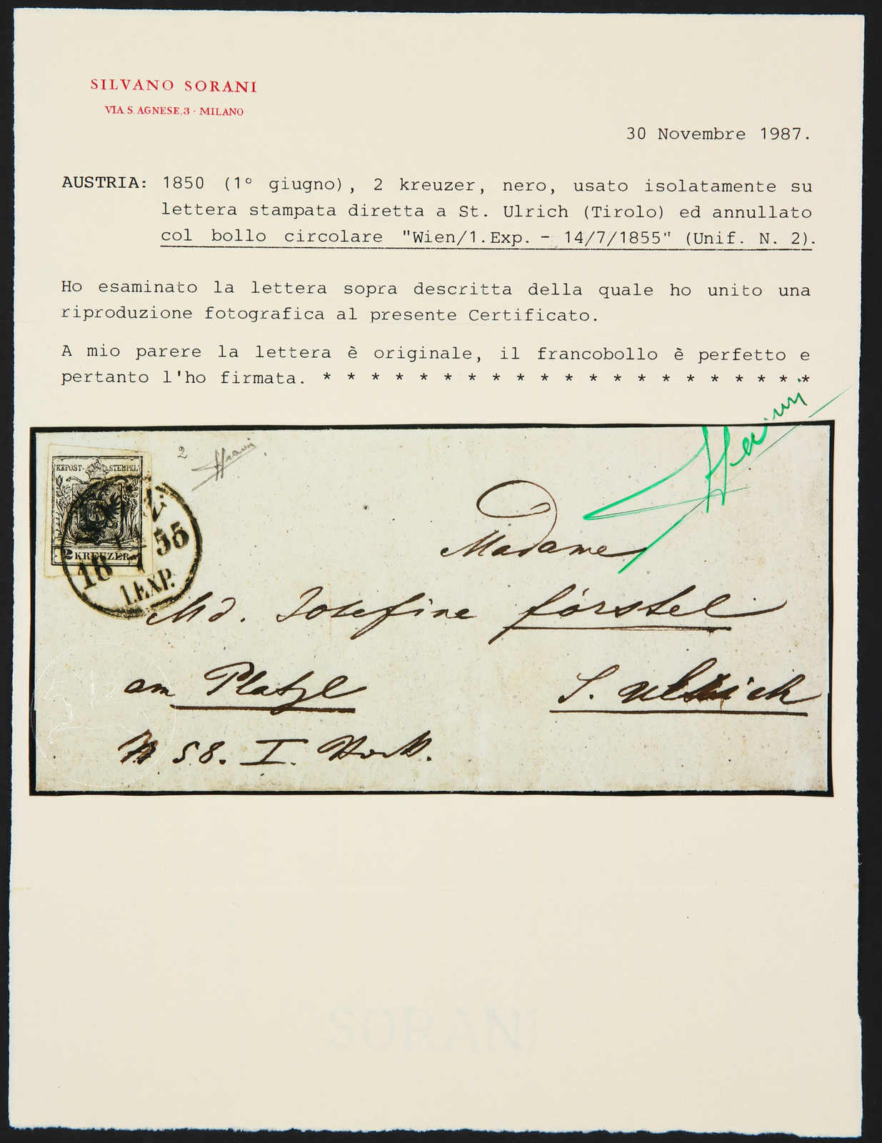 1850, 2 kr, Handpapier, zwei Faltbriefe mit Einzelfrankaturen, je Attest S.Sorani (Image) (imagea)