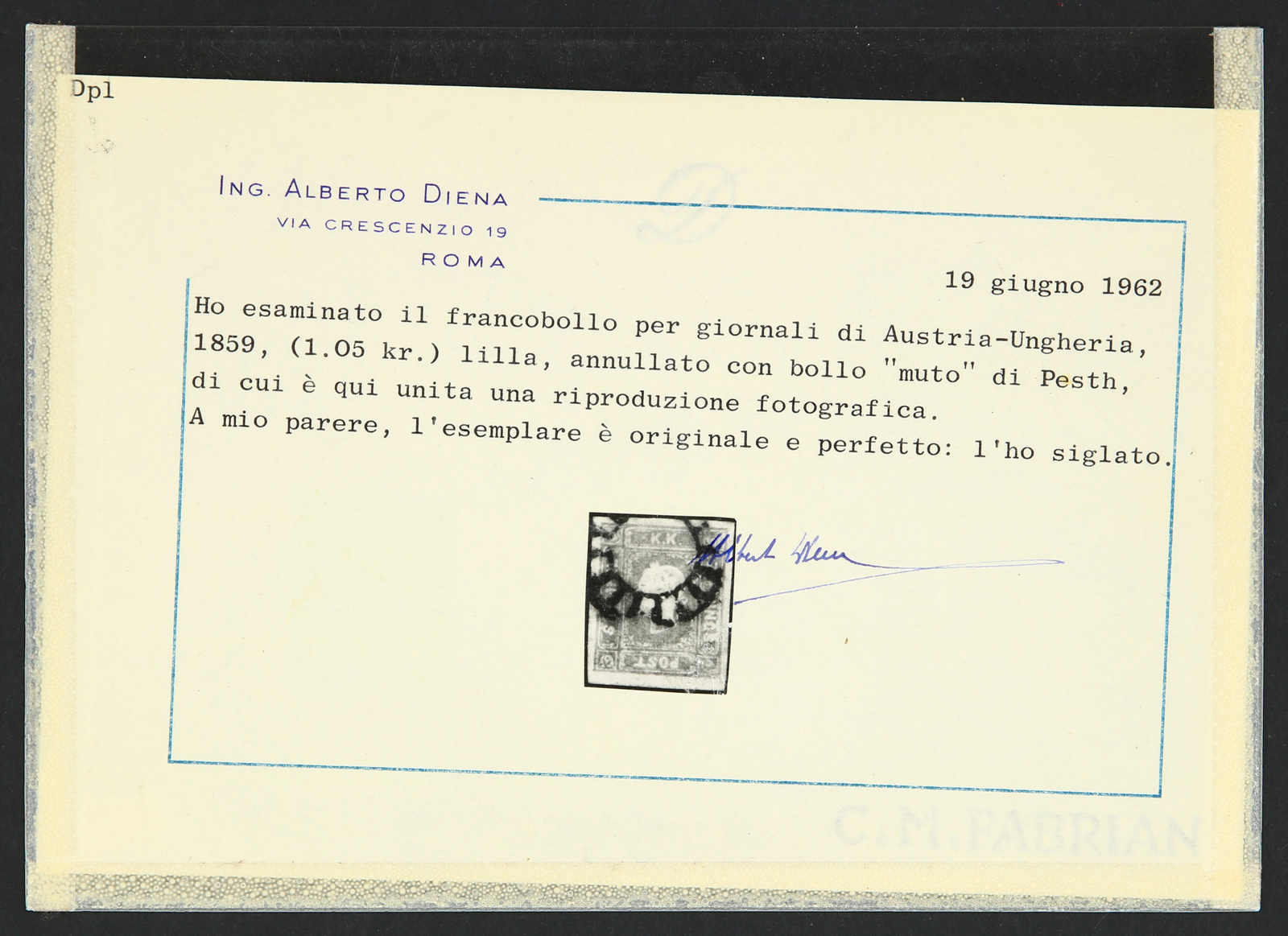 1859, 1.05 Kr. sauber entwertet mit stummem Stempel von Pesth, Attest A. Diena (Image) (imagea)