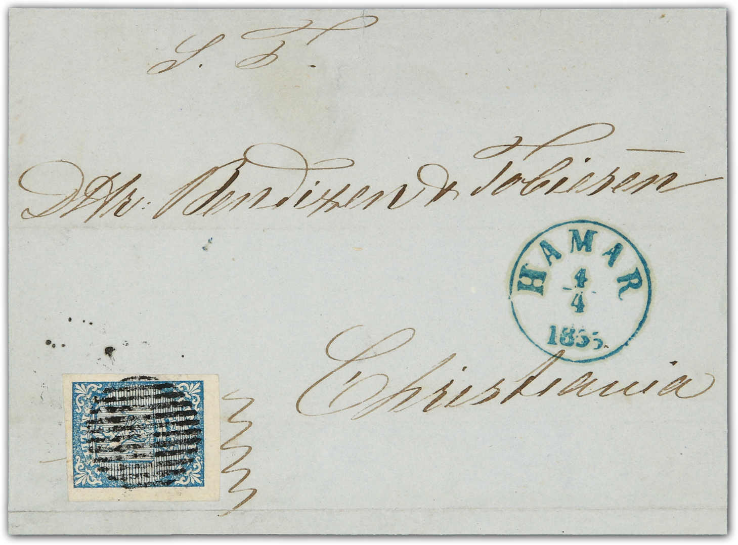 1855, single franking entire letter bearing first issue stamp tied by barred postmark, alongside 'HAMAR' cds, sent to Christiania (Image) (imagea)