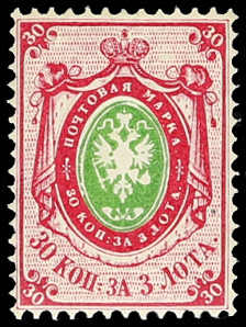 1865, 30 Kop. Staatswappen ohne Wasserzeichen auf normalem Papier, gezähnt 14½:15, ungebraucht, einwandfrei, sign. Star(auschek) und Gebr. Senf (ME 1.000,-) (Image)