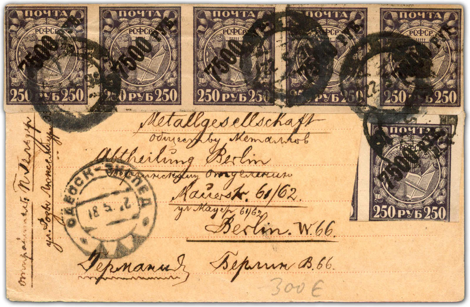 1922, 7500 R. auf 250 R. Inflationsaufdruck, waagerechter Fünferstreifen und Einzelmarke auf Ganzsachenkarte mit Ukraine-Aufdruck (vermutlich Odessa) aus Odessa 12.5.22 via Moskau nach Berlin, rückseitig langer Bedarfstext