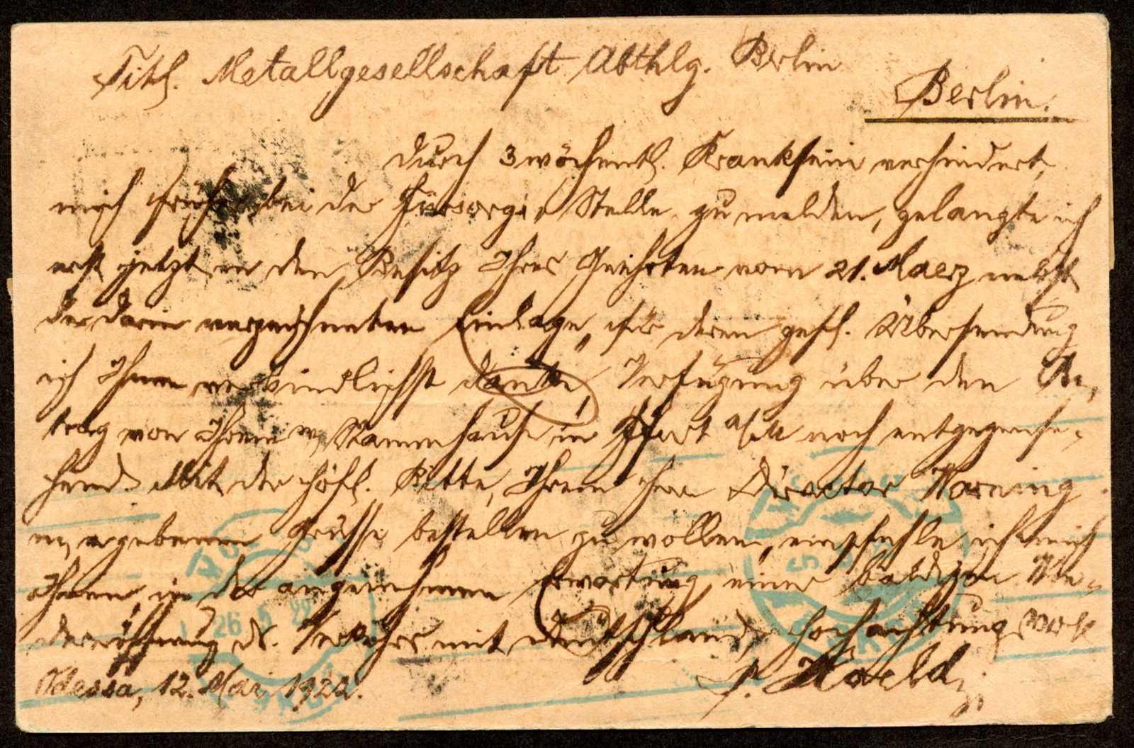 (Metallgesellschaft), der Streifen nur teils verklebt, Entwertung der Einzelmarke daher unter dem Fünferstreifen, interessanter Beleg aus der Hochinflation, gute Qualität (Image) (imagea)