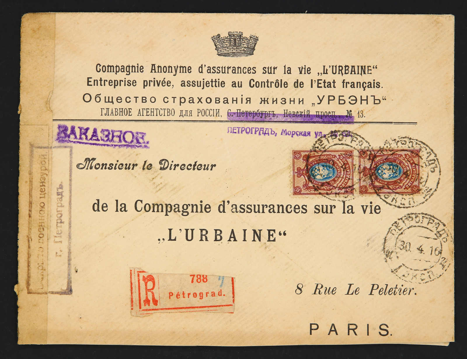 1916, eingeschriebener Vordruckbrief einer Versicherung ab "PETROGRAD 30.4.16" mit senkrechtem Paar 15 Kop. Wappenausgabe, adressiert nach Paris, zensuriert (Image) (imagea)