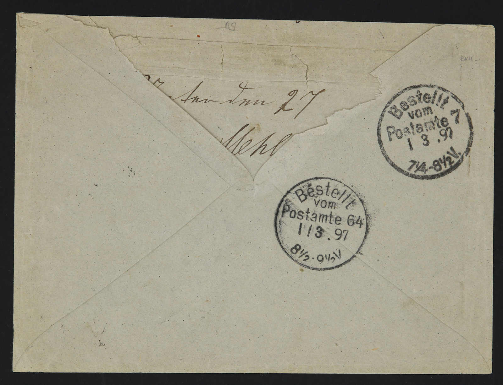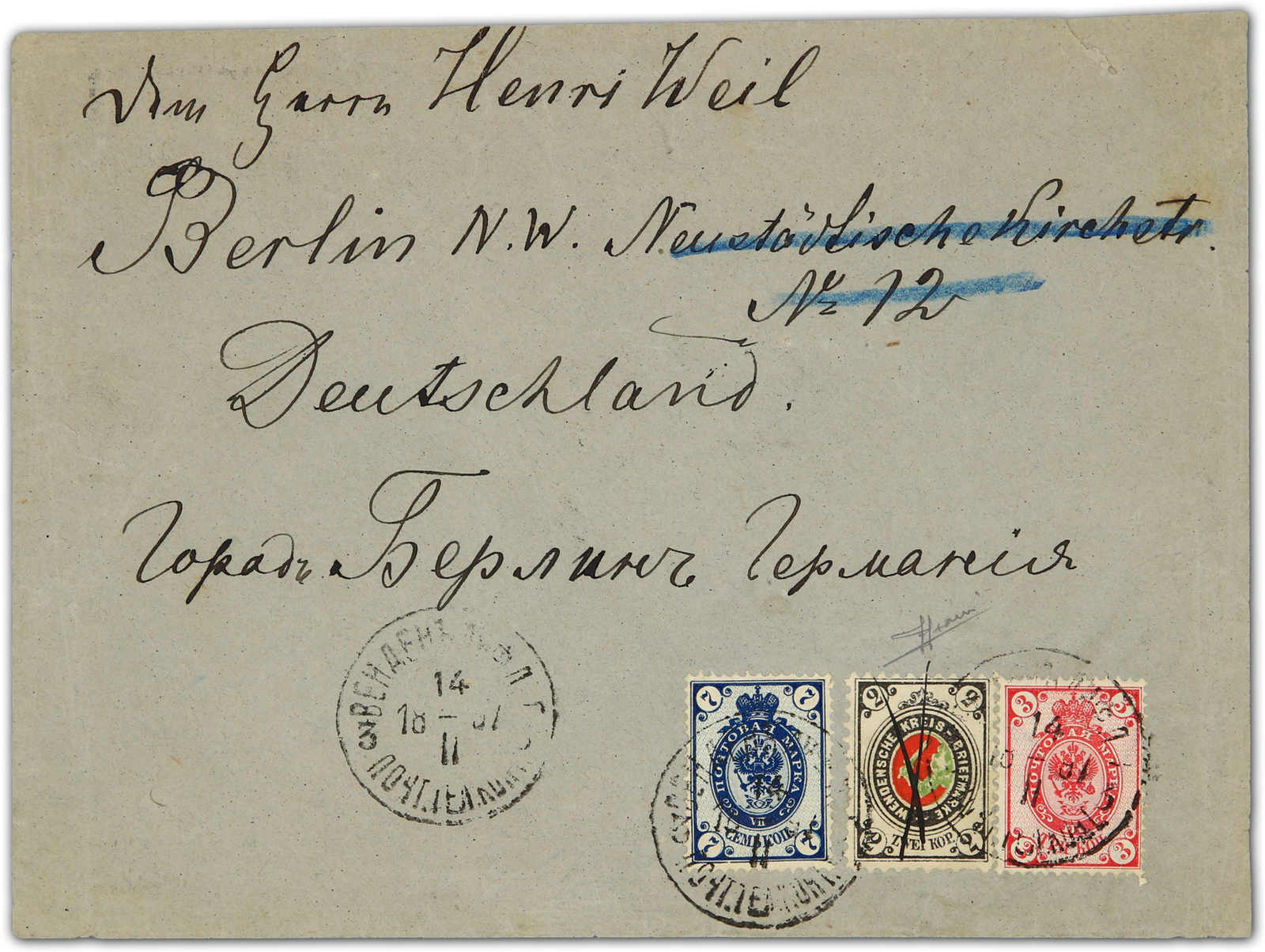 1897, cover from Cēsis - Wenden / Latvia to Berlin bearing 3 kop, red & 7 kop, blue and local issue 2 kop wenden issue tied by postmark dated 14,2,97 cds