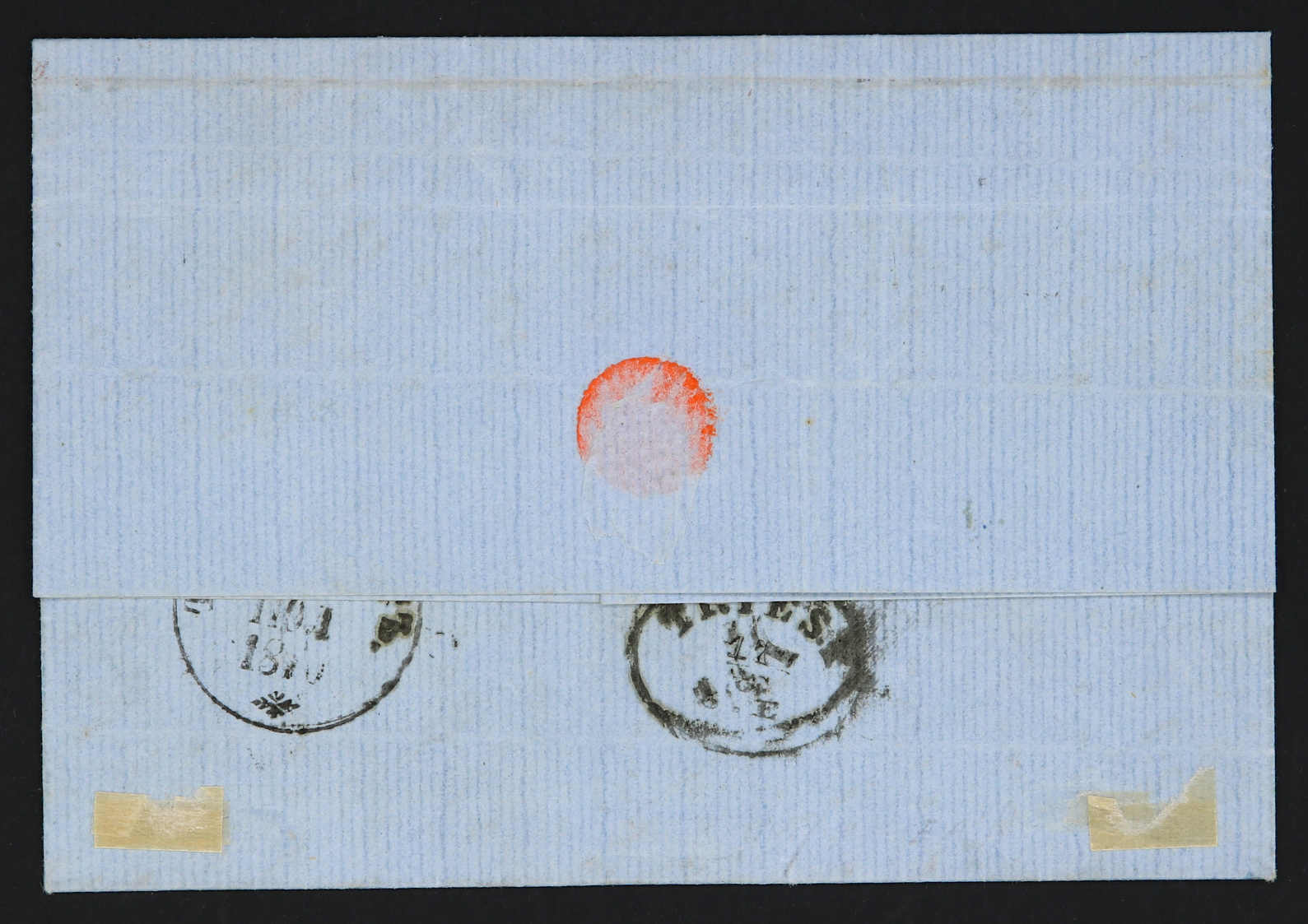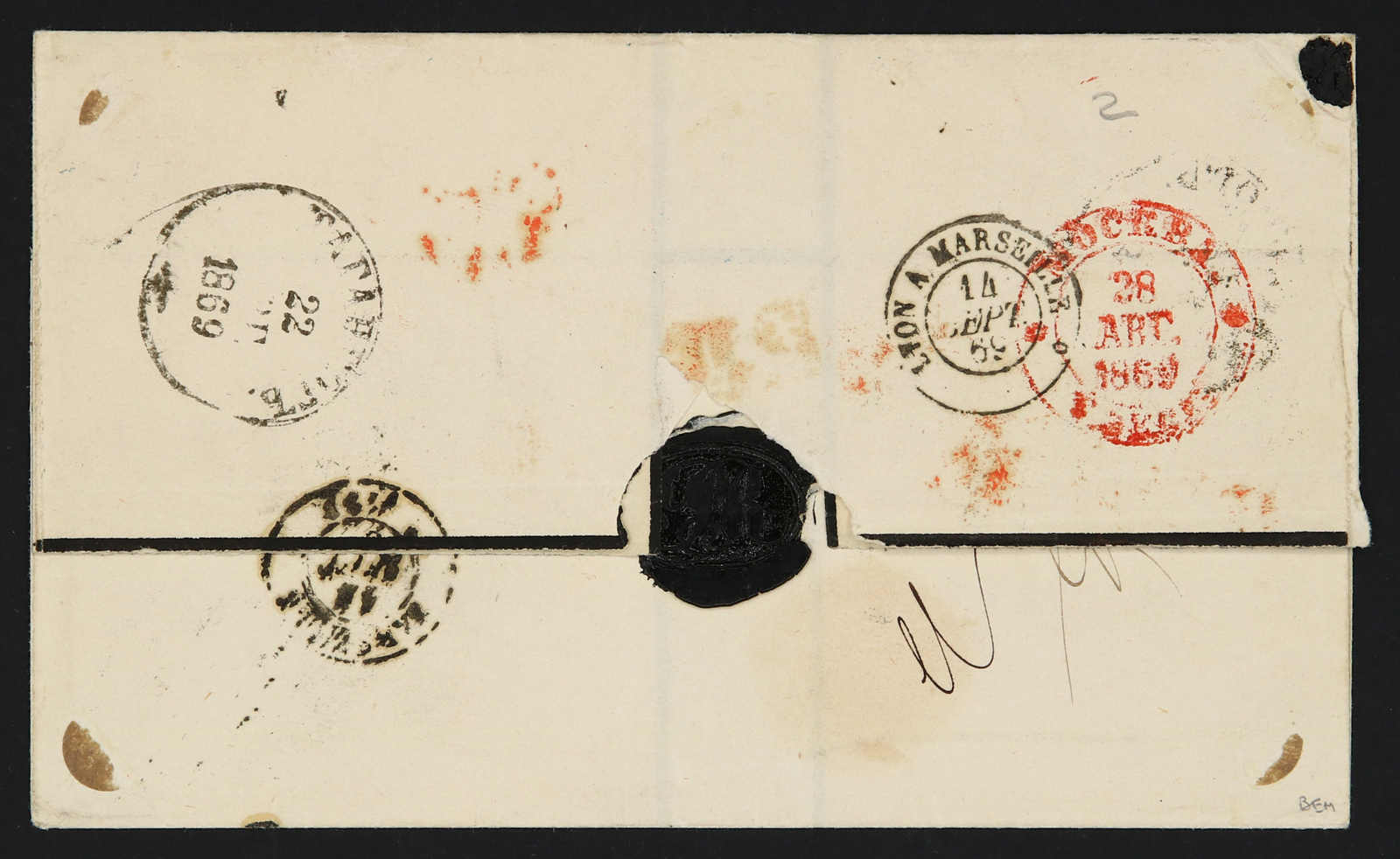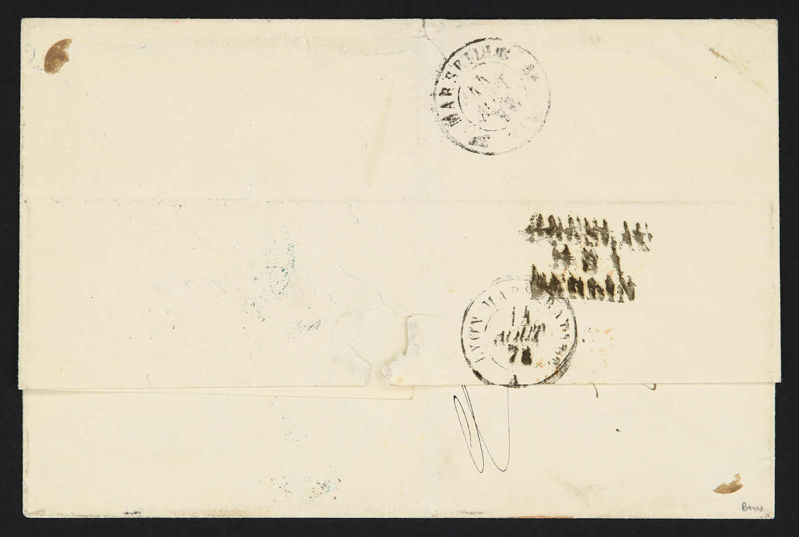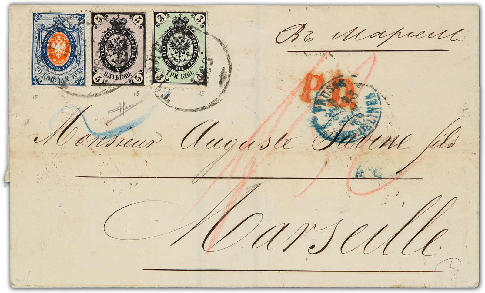 1869, entire letter from Taganrog to Marseille / France bearing three color franking 3 kop.black/green & 5 kop, black/lilac & 20 kop, blue/orange tied by circular "Taganrog" cds, alongside Prusse transit, on reverse transit and arrival