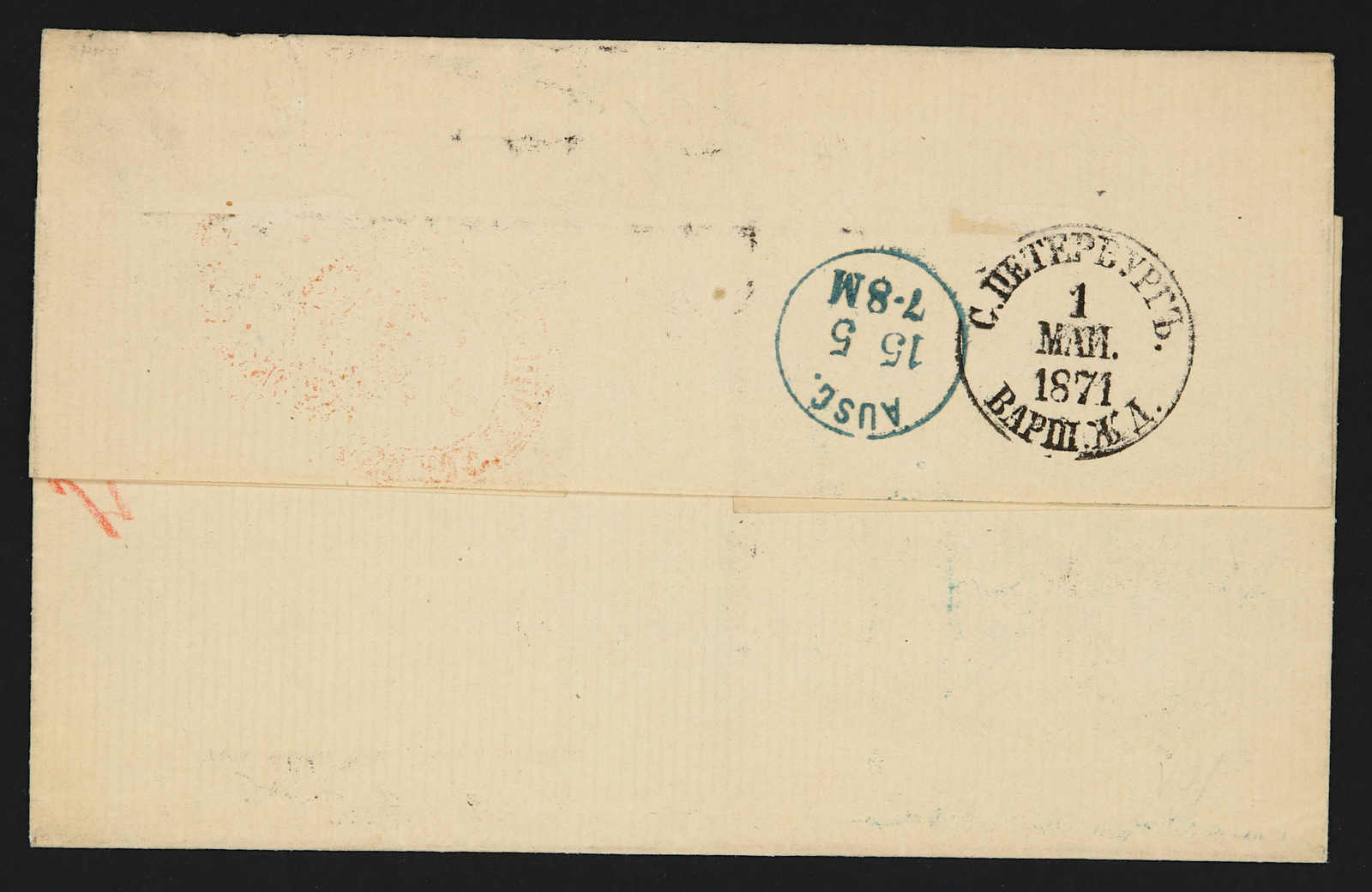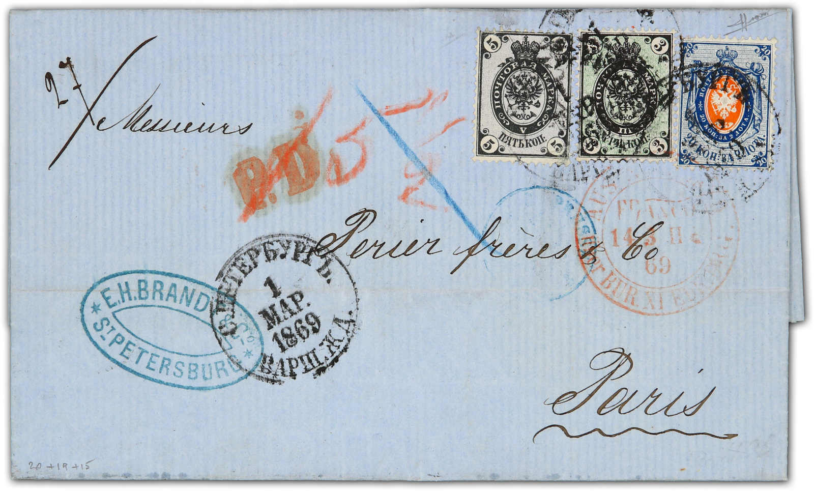 1869, entire letter from St. Petersburg to Paris / France bearing three color franking 3 kop. black/green, 5 kop. black/lilac and 20 kop. blue/orange tied by circular "St. Petersburg" cds, alongside Prusse transit, on reverse transit and