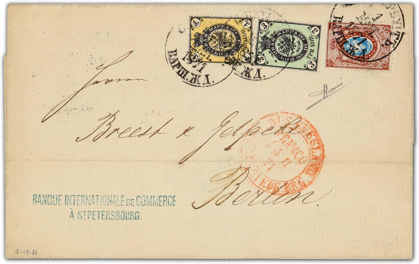 1871, entire letter from St. Petersburg to Berlin bearing three color franking 3 kop.black/green & 1 kop, black/yellow & 10 kop, blue/brown tied by circular "St. Petersburg" cds, on reverse transit and arrival cds (Image) (imagea)