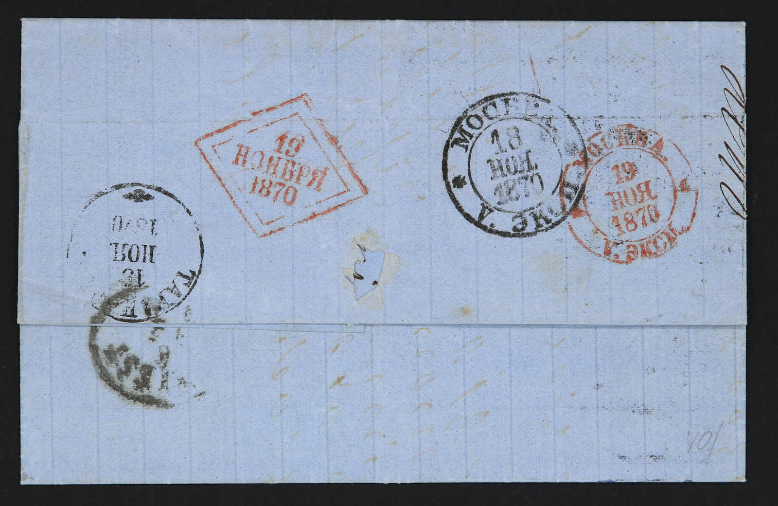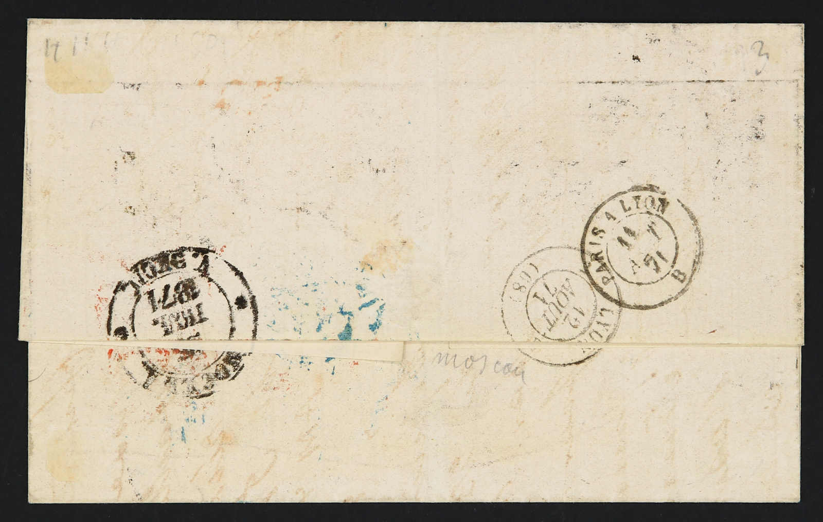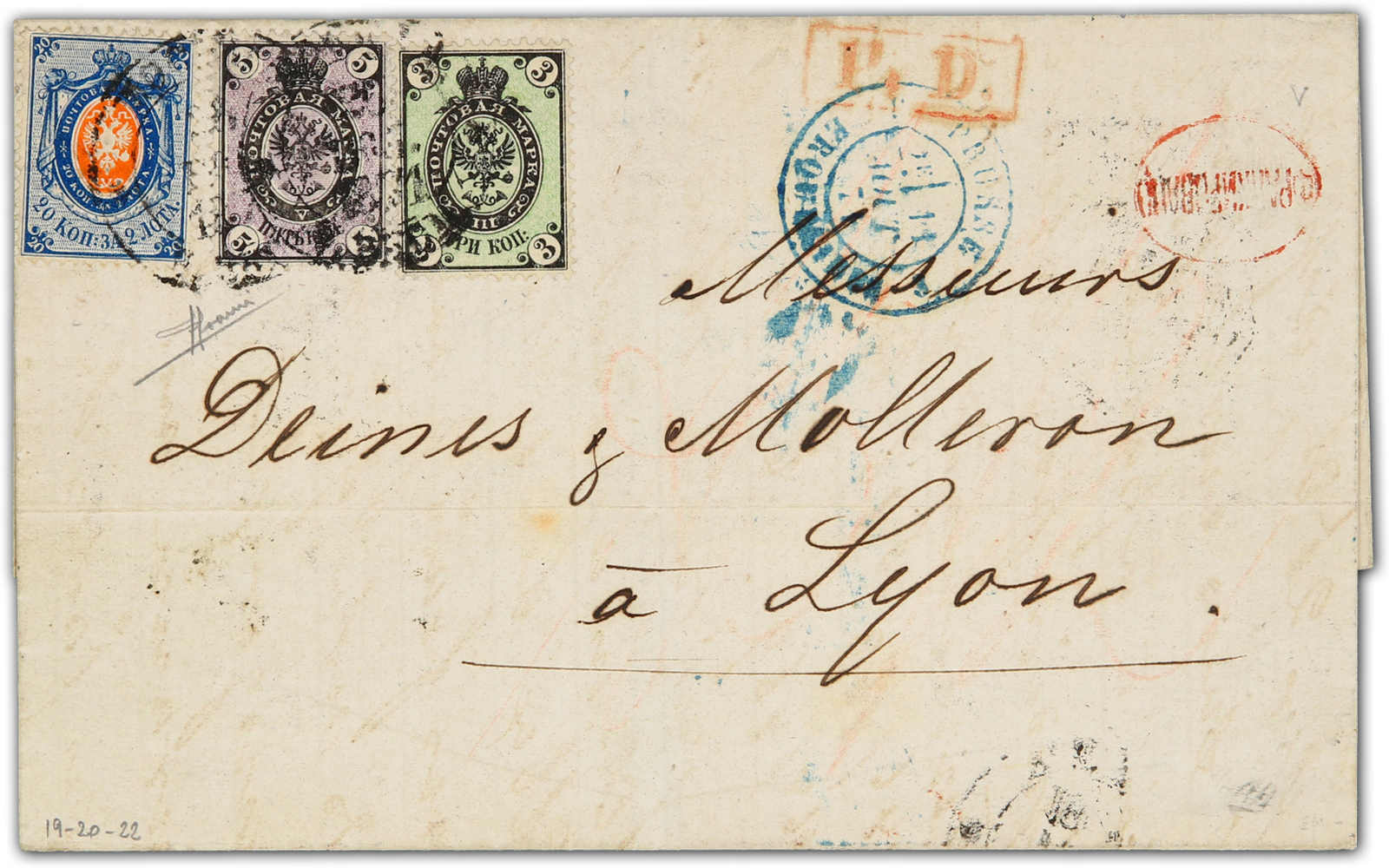 1871, entire letter from Moscow to Lyon / France bearing three color franking 3 kop. black/green, 5 kop. black/lilac and 20 kop. blue/orange tied by circular unclear postmarks, alongside Prusse transit, on reverse transit and arrival