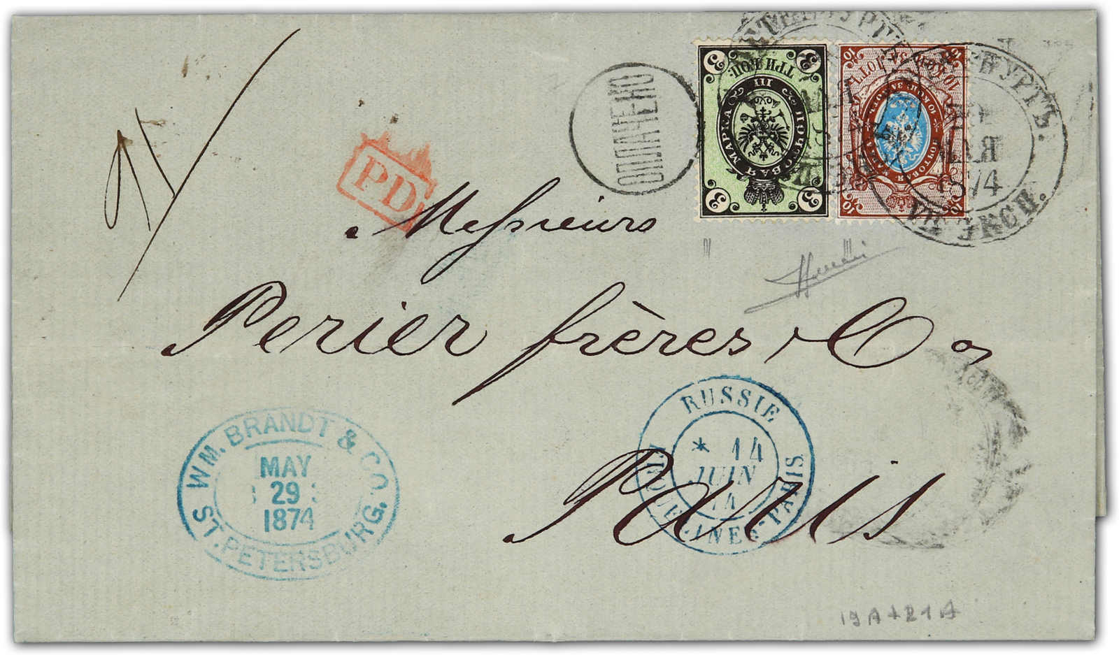 1874, entire letter from St. Petersburg to Paris bearing two color franking 3 kop. black/green and 10 kop. blue/brown tied by circular "St. Petersburg" cds, on reverse arrival cds (Image) (imagea)