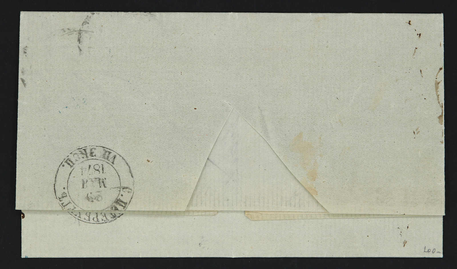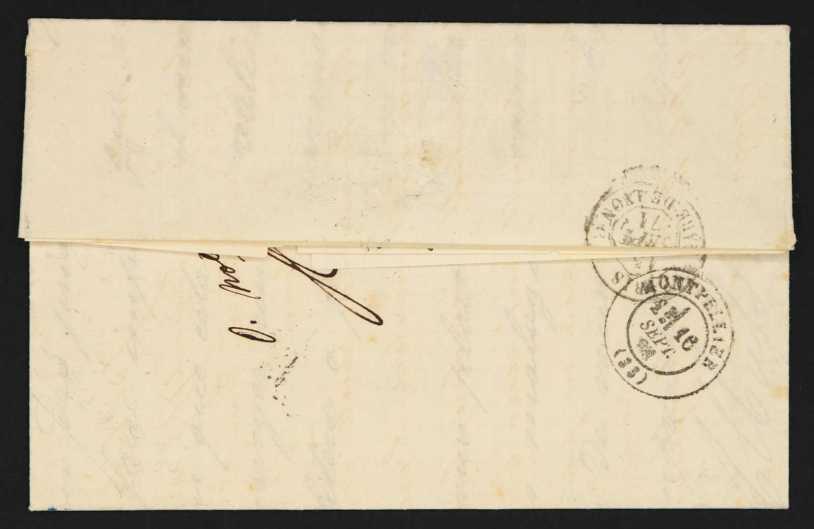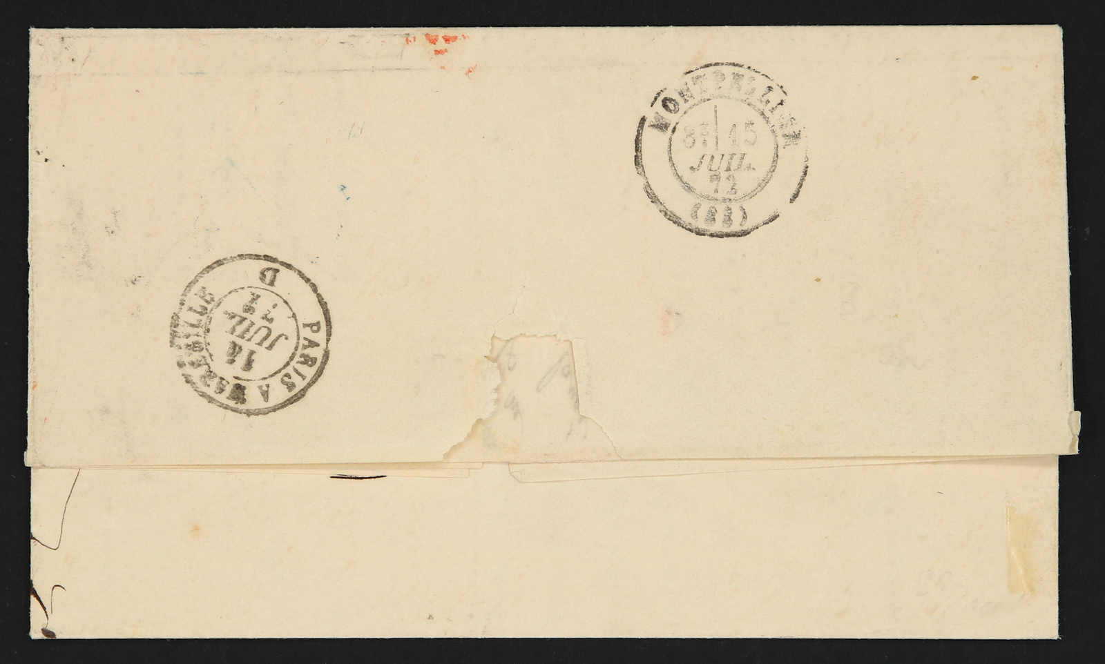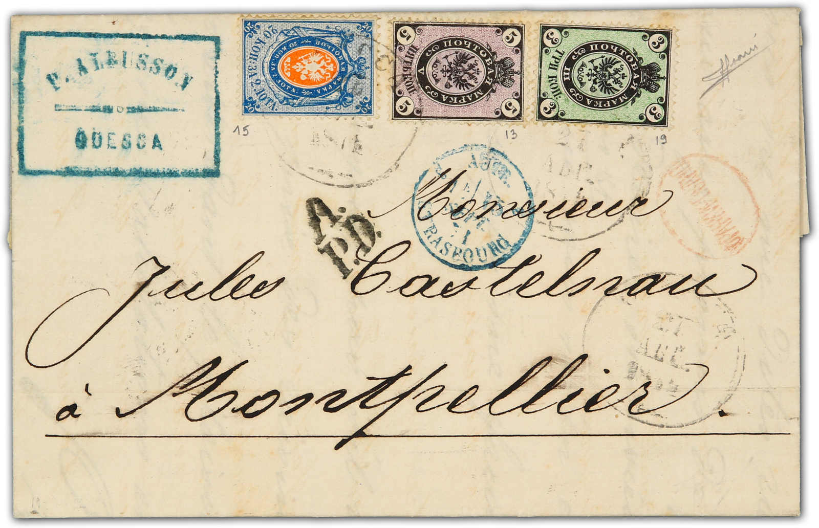 1871, entire letter from Odessa to Montpellier / France bearing three color franking 3 kop.black/green & 5 kop, black/lilac & 20 kop, blue/orange tied by circular "Odessa" cds, on reverse transit and arrival cds (Image) (imagea)