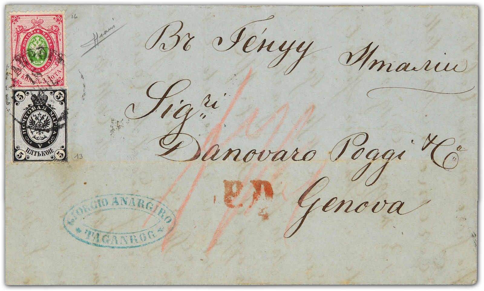 1870, entire letter from Taganrog to Genova / Italy bearing two color franking 5 kop. black/lilac and 30 kop, red/green tied by circular "Taganrog" cds, on reverse transit and arrival cds (Image) (imagea)