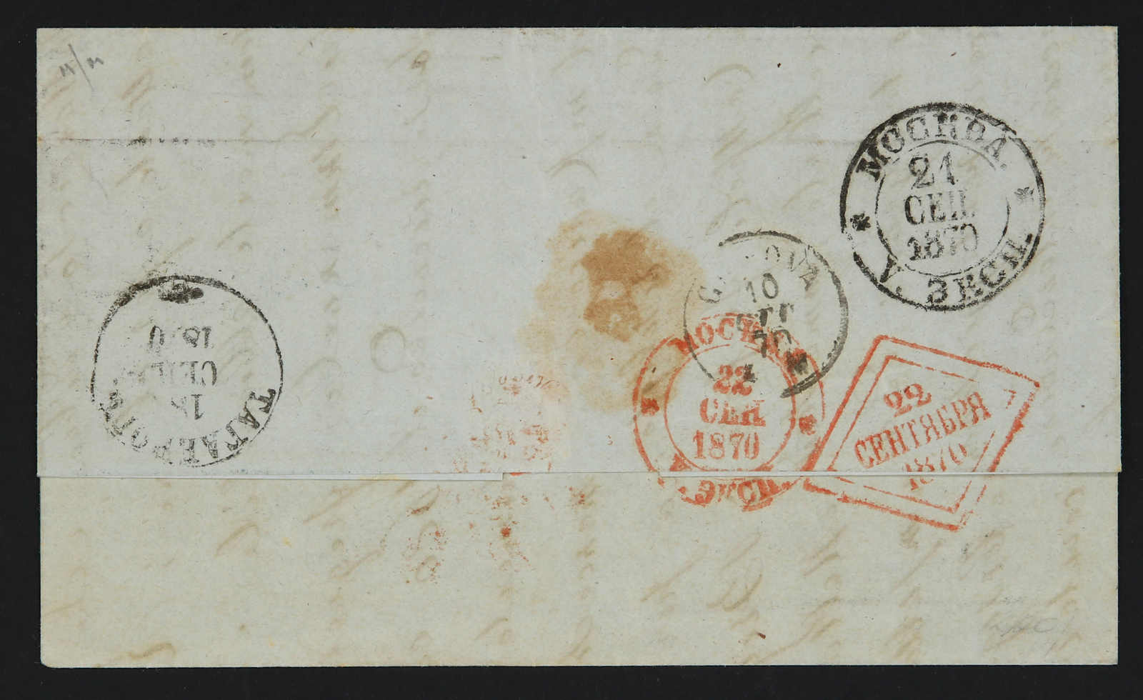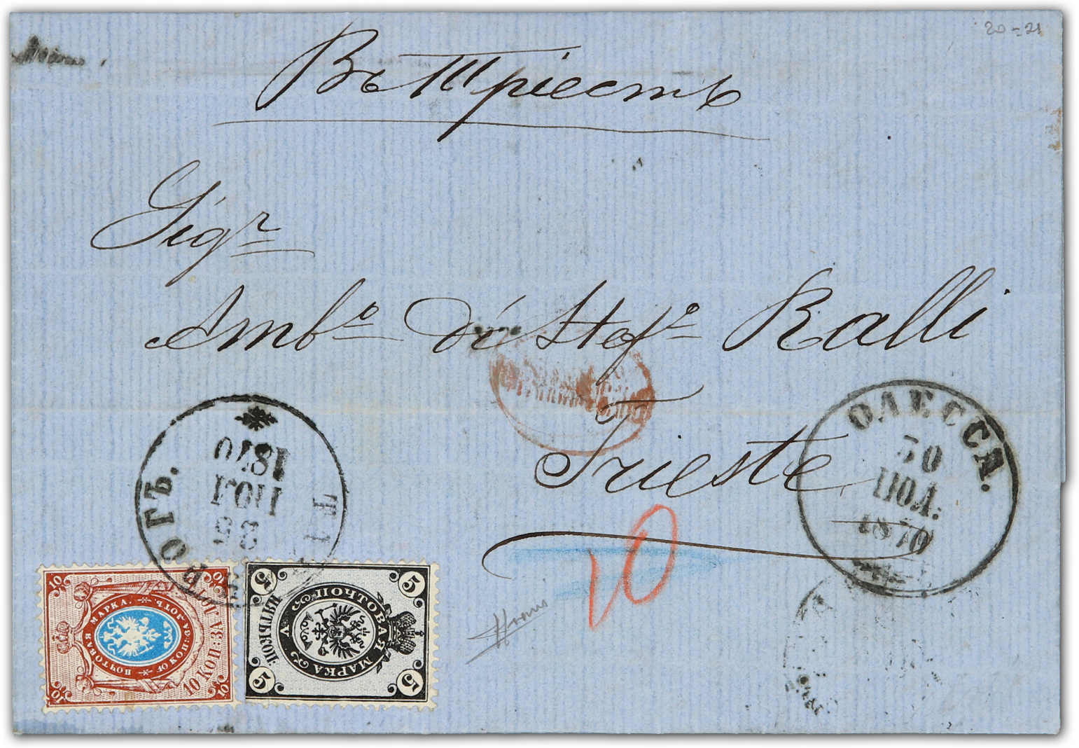 1870, entire letter from Taganrog to Triest / Italy via Odessa bearing 5 kop. black/lilac and 10 kop. blue/brown tied by circular "Taganrog" cds, on reverse transit and arrival cds (Image) (imagea)