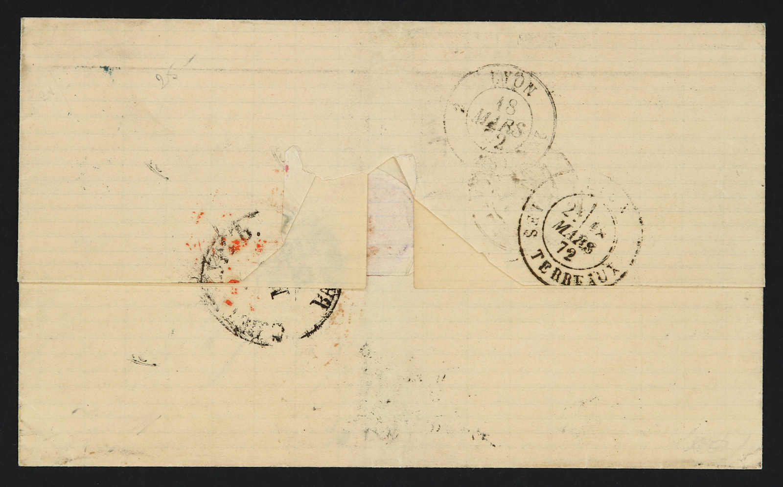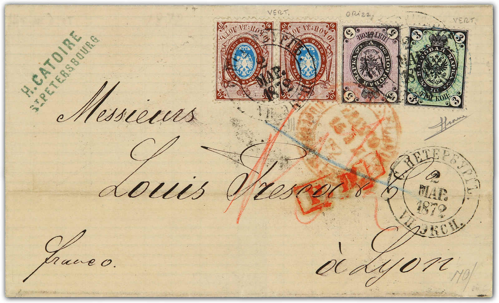 1872, entire letter from St. Petersburg to Lyon / France bearing three color franking 3 kop. black/green, 5 kop. black/lilac and pair 10 kop. blue/brown tied by circular "St. Petersburg" cds, on reverse transit and arrival cds (Image) (imagea)