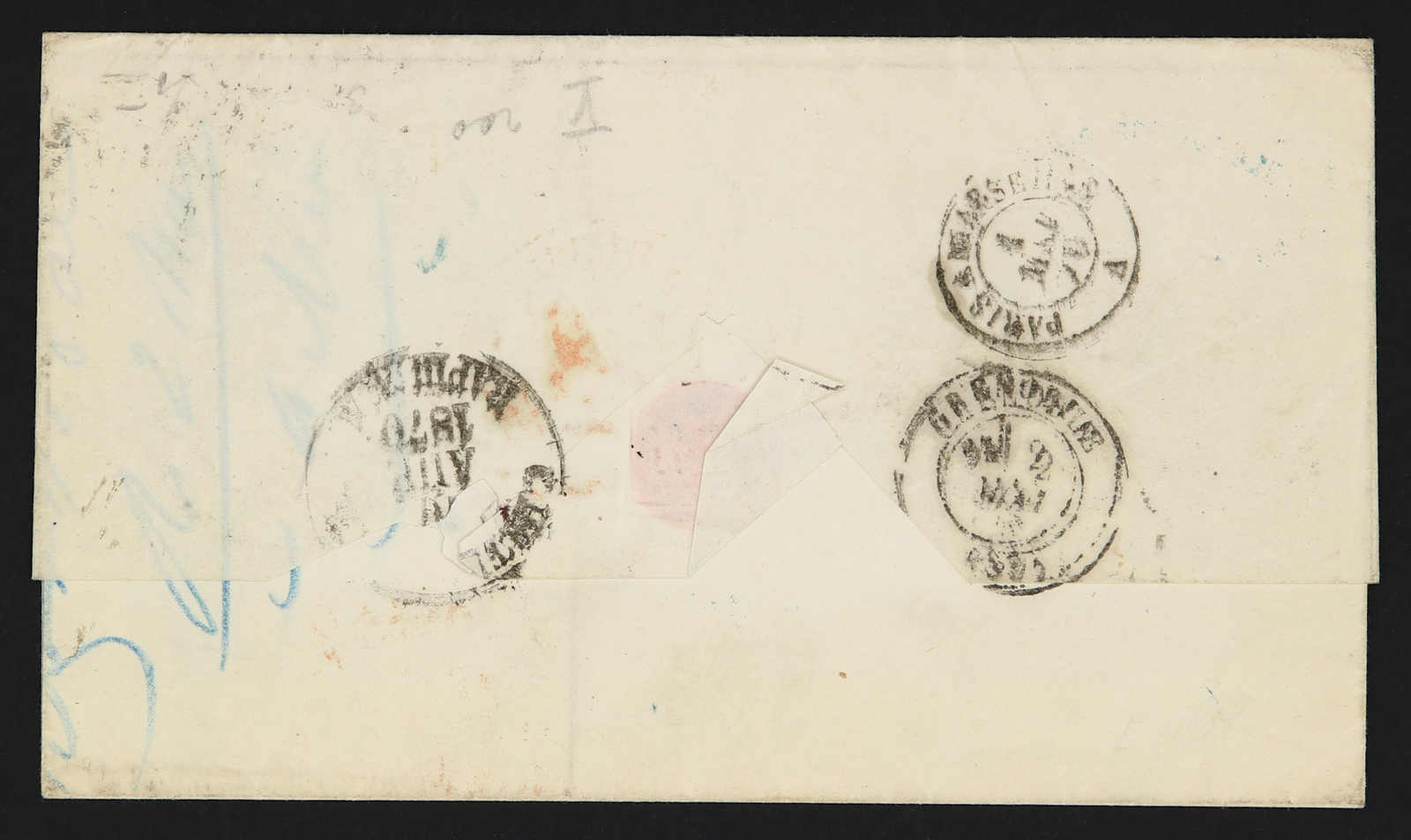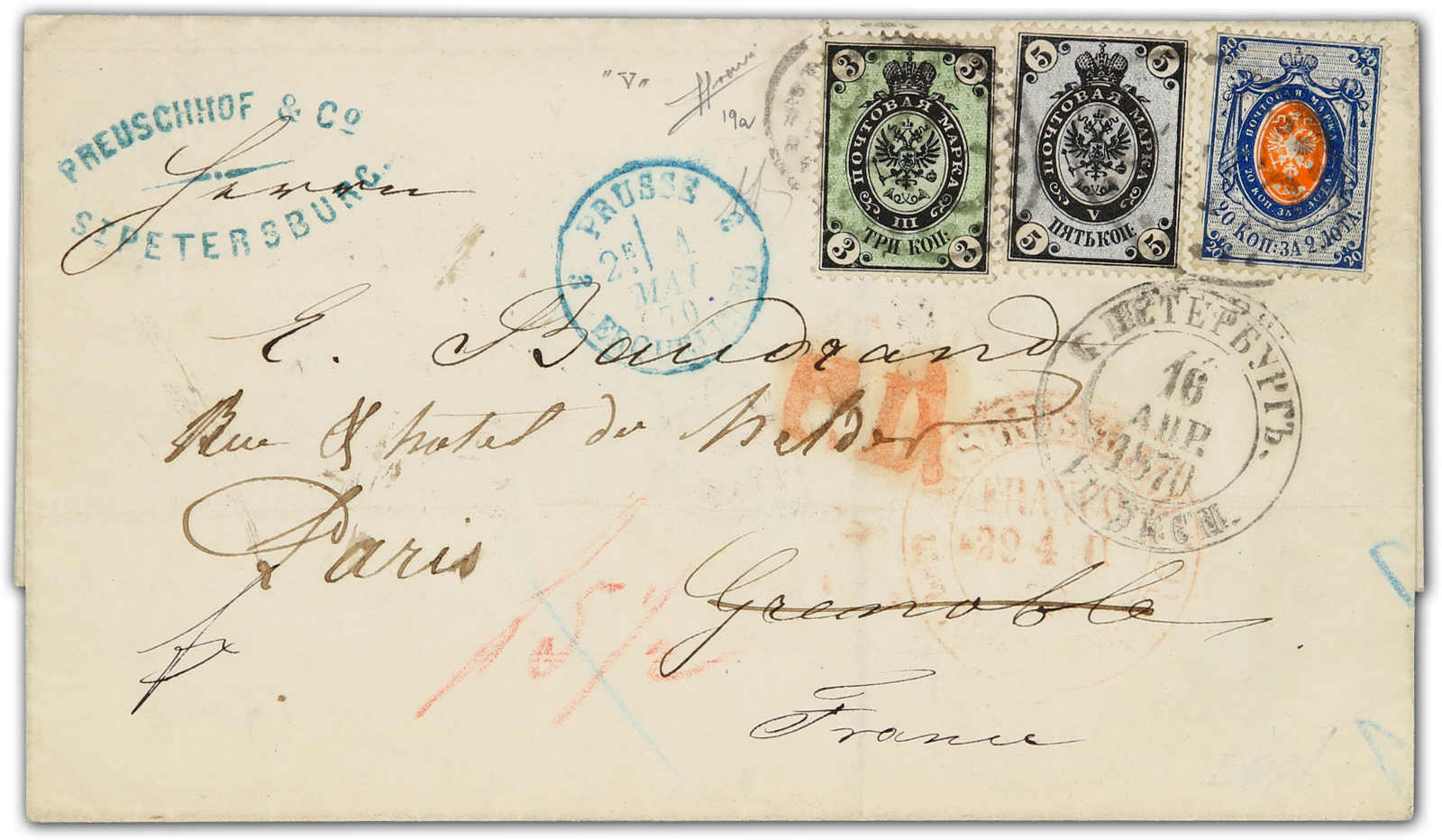 1870, entire letter from St. Petersburg to Grenoble/France then redirected to Paris bearing three color franking 3 kop. black/green, 5 kop. black/lilac and 20 kop. blue/orange tied by circular oval postmarks and alongside "St. Petersburg"