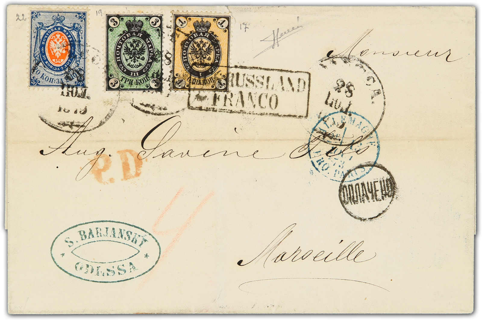 1873, entire letter from Odessa to Marseille / France bearing three color franking 3 kop. black/green, 1 kop. black/yellow and 20 kop. blue/orange tied by circular "Odessa" cds, also "RUSSLAND FRANCO" transit cachet, on reverse transit